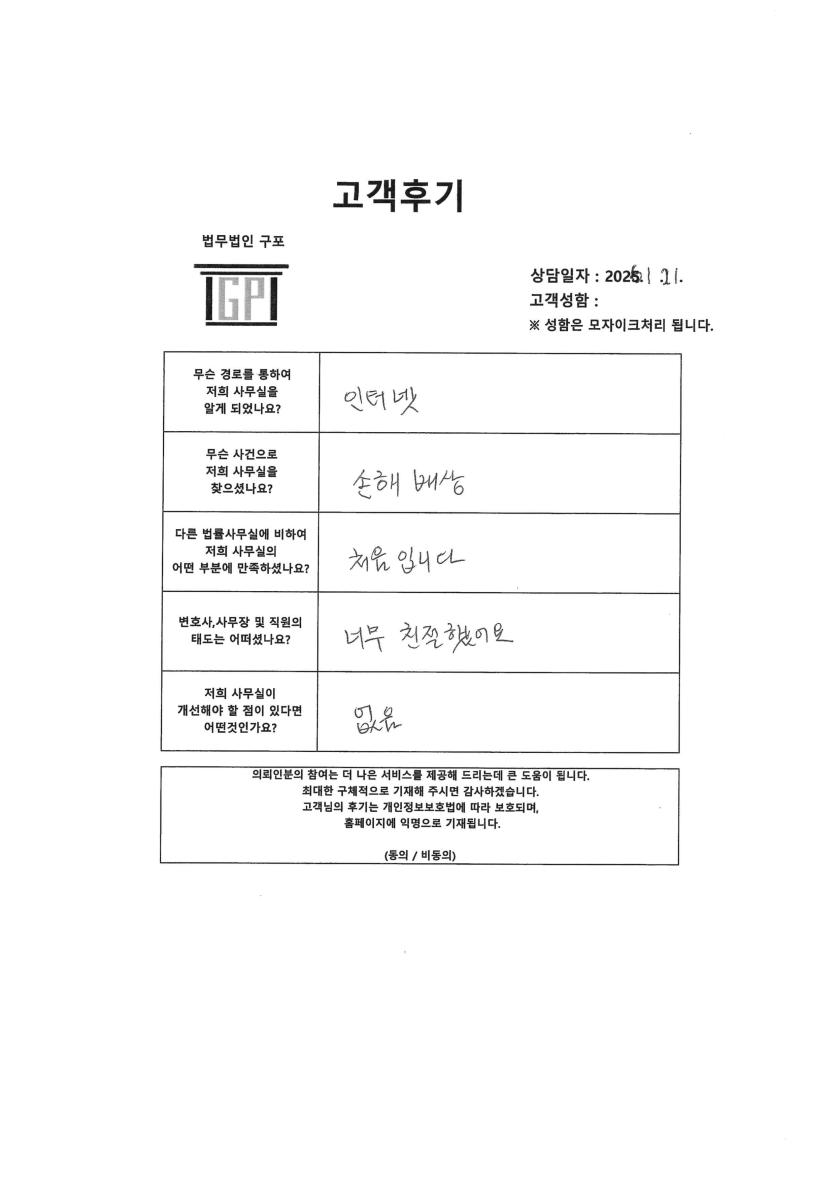 손해배상청구소송 - 의뢰인분의 실제 고객후기