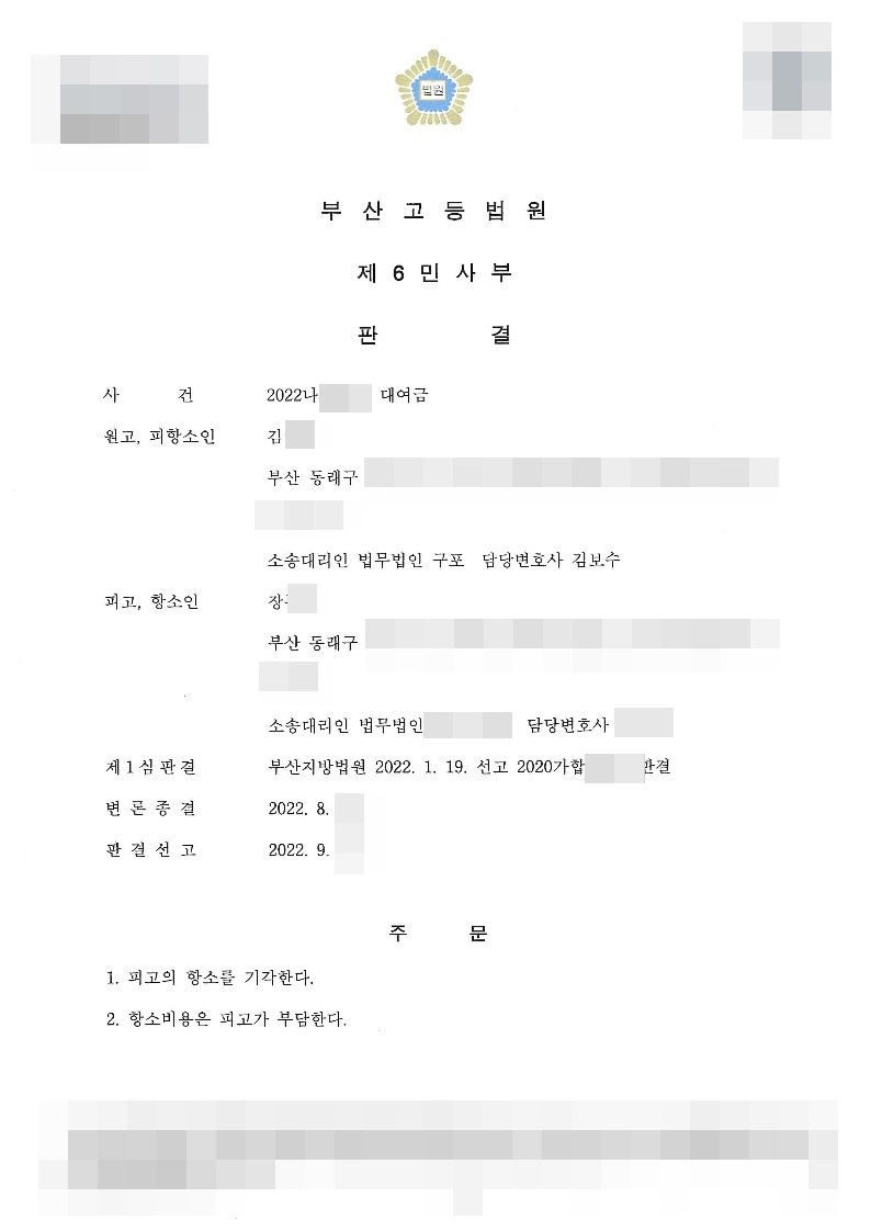 법무법인 구포는 2심에서도 의뢰인을 대리하여 상대방의 주장이 거짓임을 밝혔고, 결국 항소심은 상대방의 항소를 기각하여 의뢰인은 대여금 2억8천만원에 대하여 전부 승소판결을 받을 수 있었습니다.