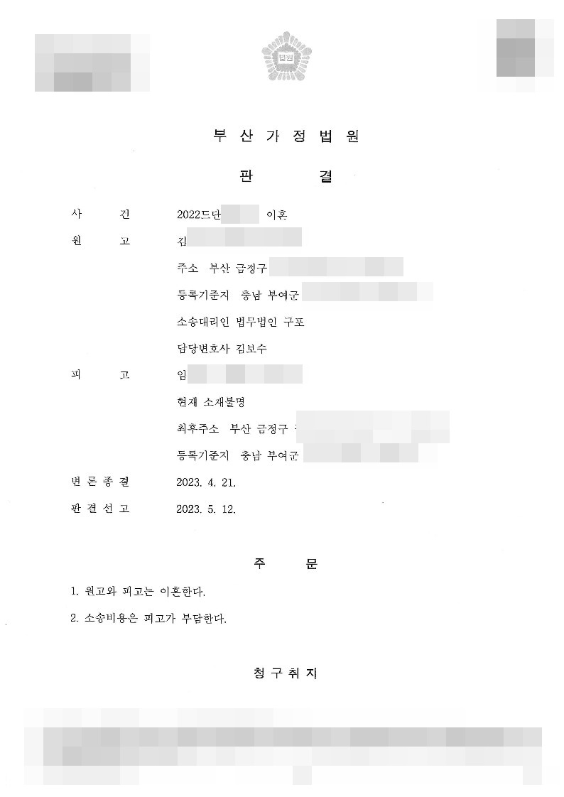 법무법인 구포의 주장을 받아들인 재판부는 의뢰인과 배우자는 이혼한다는 판결을 선고했으며, 의뢰인은 길고 긴 고통에서 해방될 수 있었습니다.