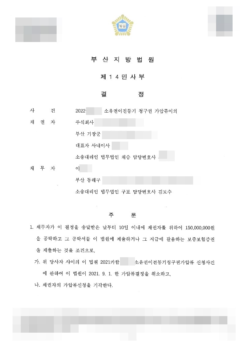 이에 의뢰인은 보증보험증권을 통하여 가압류 전부를 취소할 수 있었고, 자신의 재산권에 대한 부당한 침해를 방어할 수 있었습니다.