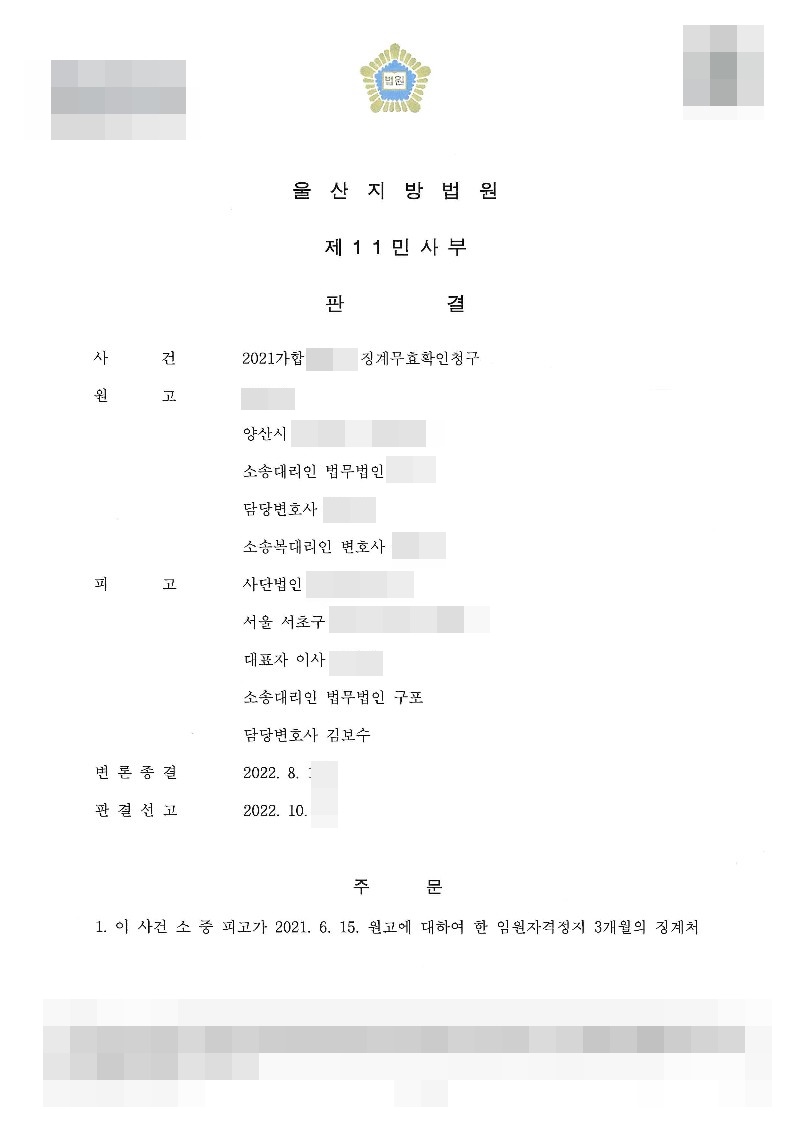 법무법인 구포의 주장을 받아들인 재판부는 회원의 징계무효확인청구는 각하하였고, 나머지 청구는 전부 기각하여 의뢰인 법인은 위 소송에서 전부 승소할 수 있었습니다.