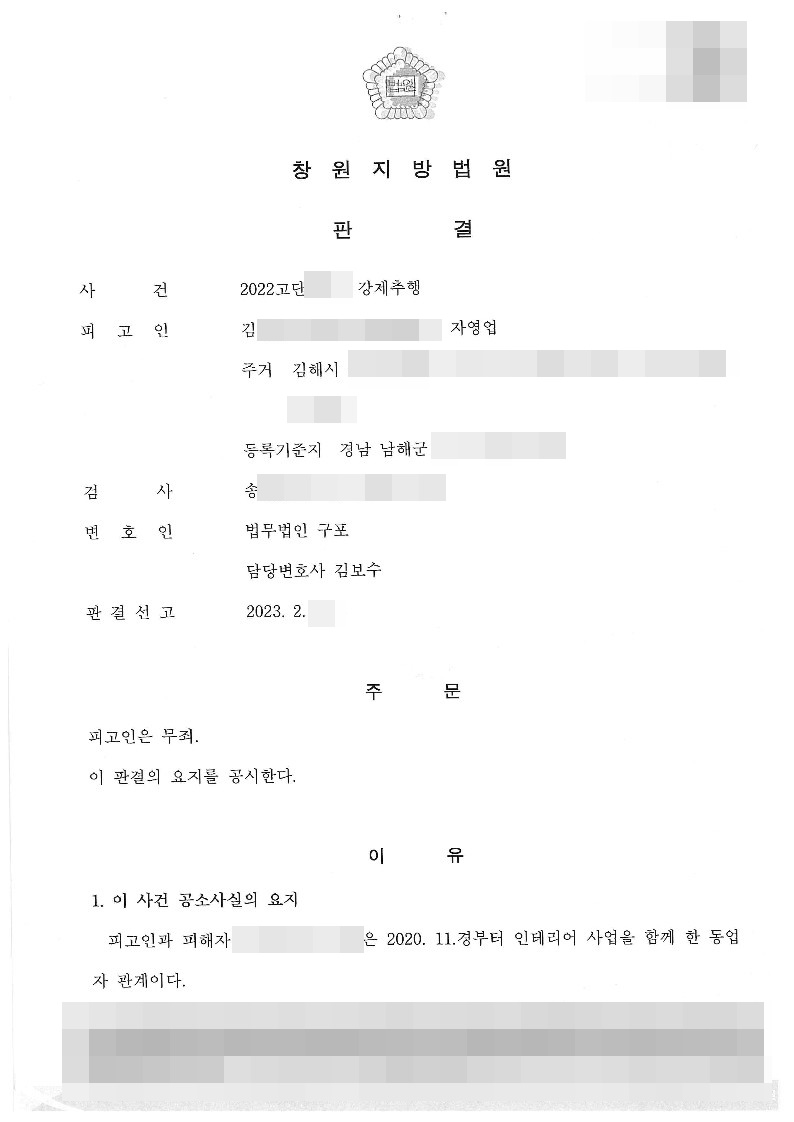법무법인 구포의 변론을 받아들인 재판부는 의뢰인에 대하여 무죄를 선고하였습니다.