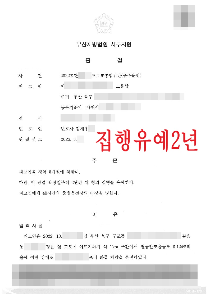 [형사] 음주운전(도로교통법위반) - 집행유예2년