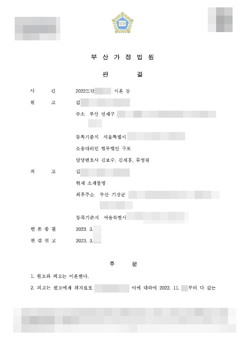법무법인 구포의 주장을 받아들인 재판부는 이혼과 더불어 위자료, 과거 양육비를 전부 인정하는 내용으로 의뢰인 승소 판결을 내렸습니다.