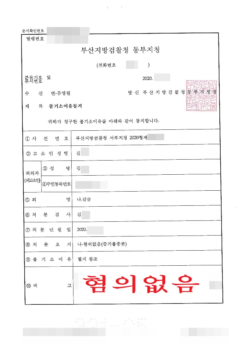 [형사] 감금, 폭행 - 혐의없음 처분사례 페이지 정보 최고관리자 작성일23-01-13 목록 본문 사건 : 감금, 폭행 처분요지 : 혐의없음 <불기소이유서> 감금,폭행 - 혐의없음 처분사례 목록