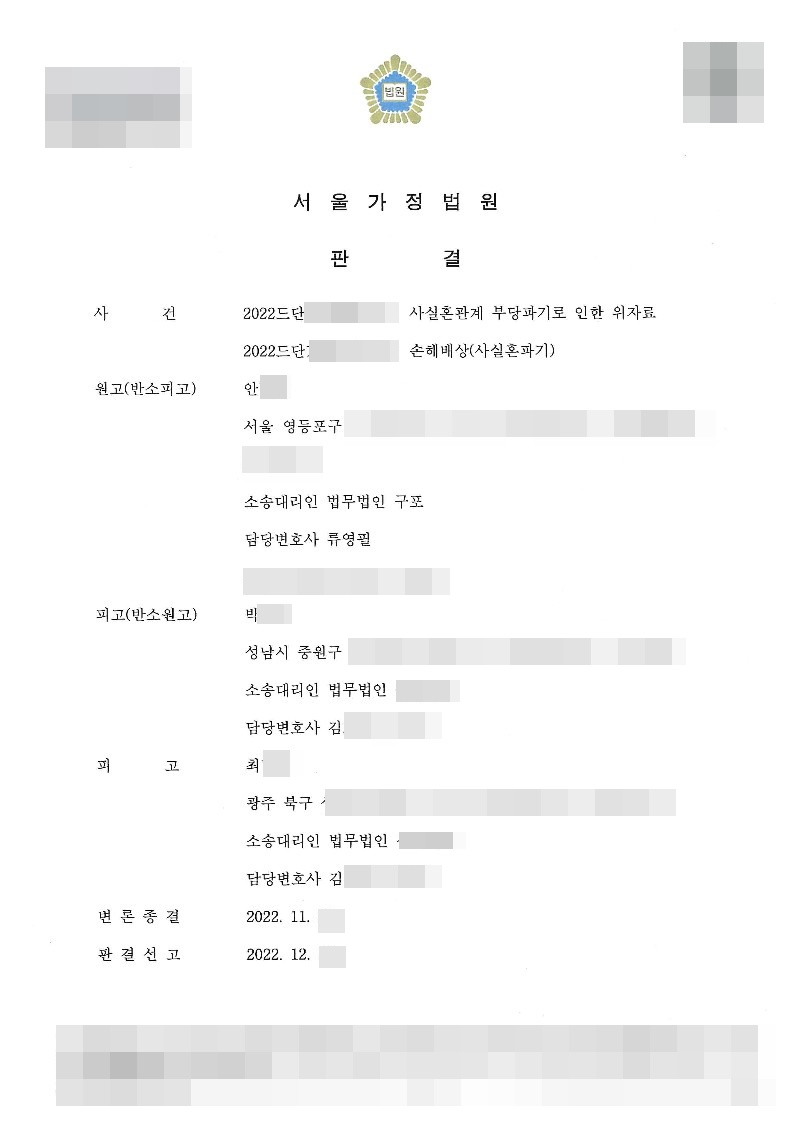 [이혼∙가사] 사실혼관계파기 - 위자료소송 (승소)
