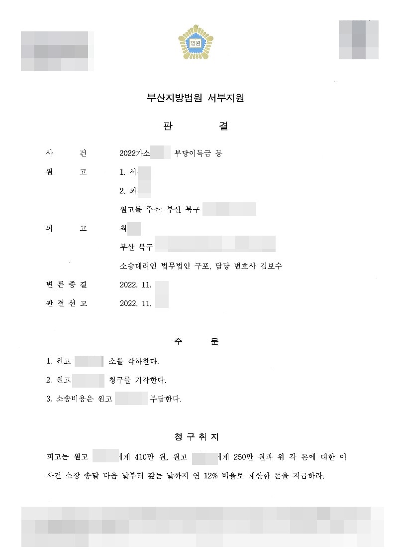 이후, 법무법인 구포 소송대리인은 원고의 주장을 반박할 관련 증거를 최대한 수집하고, 부족한 부분은 전체 스토리를 최대한 상세히 설명하는 방법으로 메꾸어나갔습니다. 그리고 원고 주장의 모순 내지 오류를 하나하나 지적하면서 치밀하게 변론을 펼쳐나간 끝에 원고 청구를 전부 기각하는 판결을 받을 수 있었습니다.