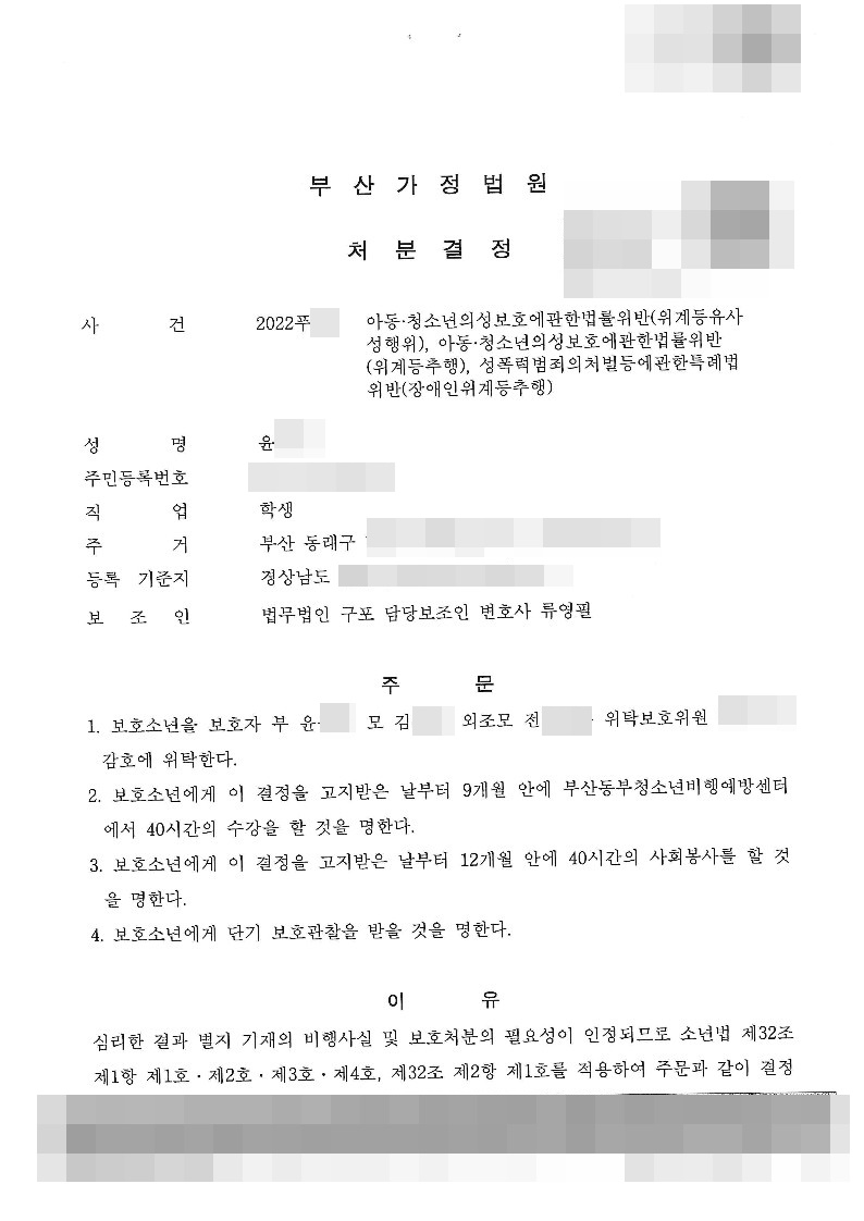그러나 보호소년은 법무법인 구포 보조인단의 적절하고 신속한 조력으로 1호,2호,3호,4호의 처분을 받아 1년의 보호관찰 기간 동안 가정에 위탁되어 무사히 학교생활을 이어갈 수 있었습니다.