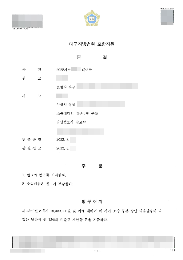 [민사] 대여금 - 원고청구기각(승소)