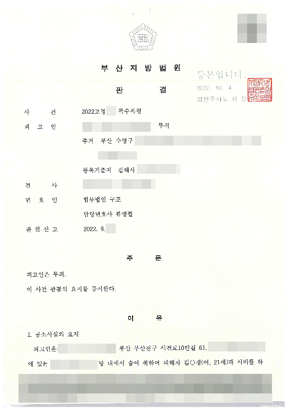 결국 재판부는 이러한 변호인의 주장을 받아들여 피고인에게 무죄를 선고하였고, 피고인은 오랜 법정 다툼 끝에 자신의 억울함을 풀고 일상으로 복귀 할수 있었습니다.
