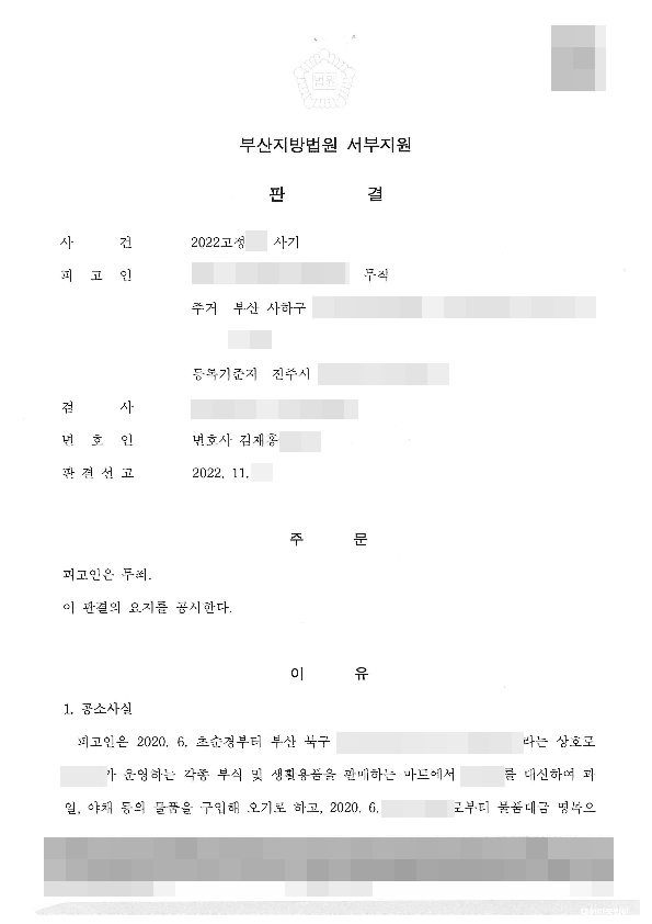 그 결과 피고인이 마트 업주로부터 지급받은 금원은 물품대금이 아닌 단순 차용금임이 인정되었고, 피고인은 무죄를 선고 받을 수 있게 되었습니다.