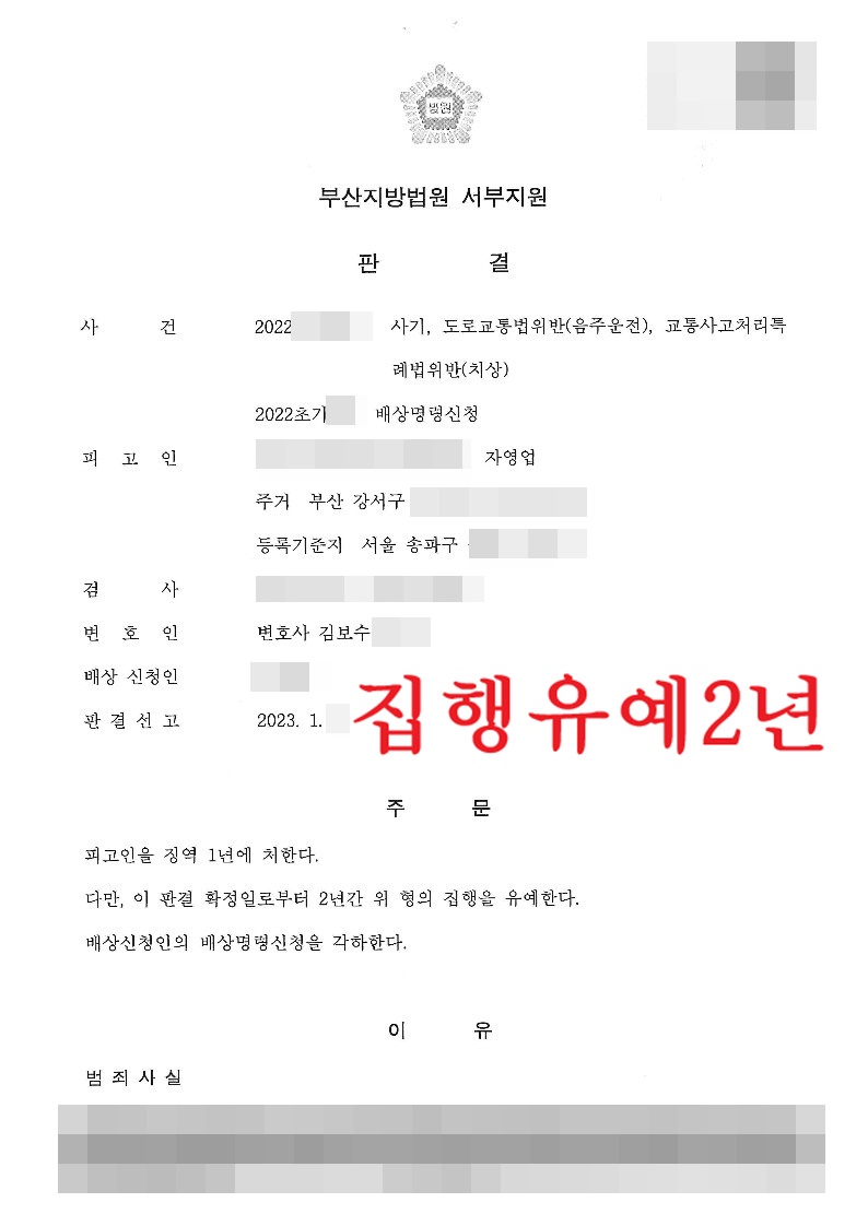 [형사] 사기,도로교통법위반(음주운전,치상) - 집행유예2년