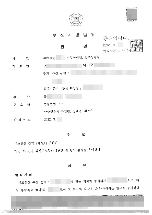 [형사] 업무상배임, 업무상횡령 - 집행유예 2년