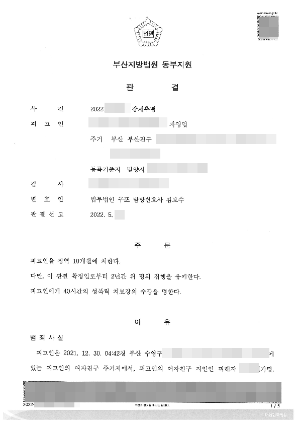변론과정에서 법무법인 구포 형사전문변호인은 피고인이 진지하게 반성하고 있는 점, 피고인이 경찰 수사 단계에서 피해자로부터 용서받고 원만하게 합의한 점, 피고인이 재범 방지를 위해 다양한 노력을 기울이고 있는 점, 범행 경위와 관련하여 다소 참작할 사정이 있는 점, 피고인의 사회적 유대관계가 공고한 점 등 피고인을 둘러싼 유리한 사정을 이유 있게 설명하였고, 재판부는 이러한 사정 등을 참작하여 검사가 청구한 신상정보 공개고지 명령은 기각하고, 집행유예의 선처를 내렸습니다.