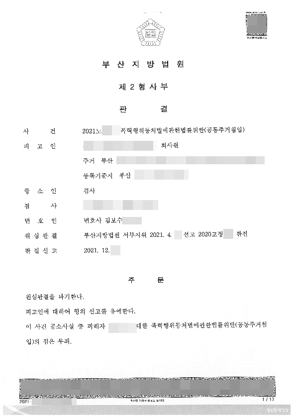 항소심법원은 변호인의 앞선 주장을 받아들여 피고인이 아내의 집에 들어간 행위에 대해서는 무죄를 선고하였습니다.