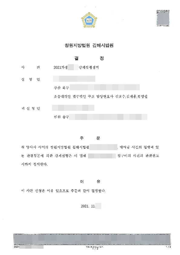 사건 담당 변호사는, 채권자의 채권이 시효소멸하였음을 주장하며 청구이의 소송을 제기함과 동시에 강제집행의 정지를 구하는 신청을 한바 인용결정을 받게 되었습니다.