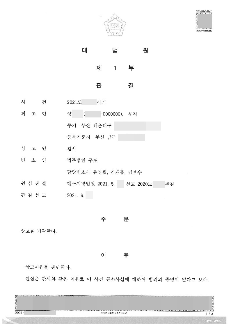 의뢰인은 보이스피싱 조직에서 현금 전달책으로 활동하였다는 이유로 구속 수사를 받던 중, 법무법인 구포의 변호인들의 조력을 받아 자신의 무죄를 입증하고 석방되었습니다. 검사는 이에 대하여 항소를 제기하였고, 의뢰인은 재차 법무법인 구포를 찾아 조력을 요청하였으며, 법무법인 구포의 변호인들은 검사의 항소를 기각시켰습니다. 이후 검사는 대법원에 이 사건을 상고하였고, 의뢰인은 다시 한번 법무법인 구포에 도움을 요청하였습니다.