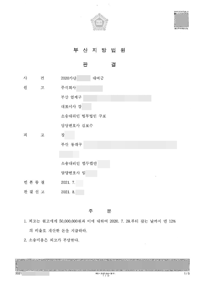 법무법인 구포의 변호사들은 의뢰인 회사와 피고가 주고 받은 내용증명에 주목, 피고가 이미 이전부터 자신이 위 금원을 빌렸다는 사실을 인정하고 있음을 주장하였습니다. 또한, 주식투자의 불확실성에 비추어 볼 때 단순히 주식 종목을 소개해 주었다는 이유만으로 감사의 표시로 5,000만원이라는 큰 금액을 증여하였다는 것은 일반상식에 비추어 볼 때 상당히 이례적이라는 사실을 지적하며 피고의 주장에는 신빙성이 없음을 밝혔습니다. 이와 같은 주장을 받아들인 법원은 원고 전부 승소판결을 내렸습니다.