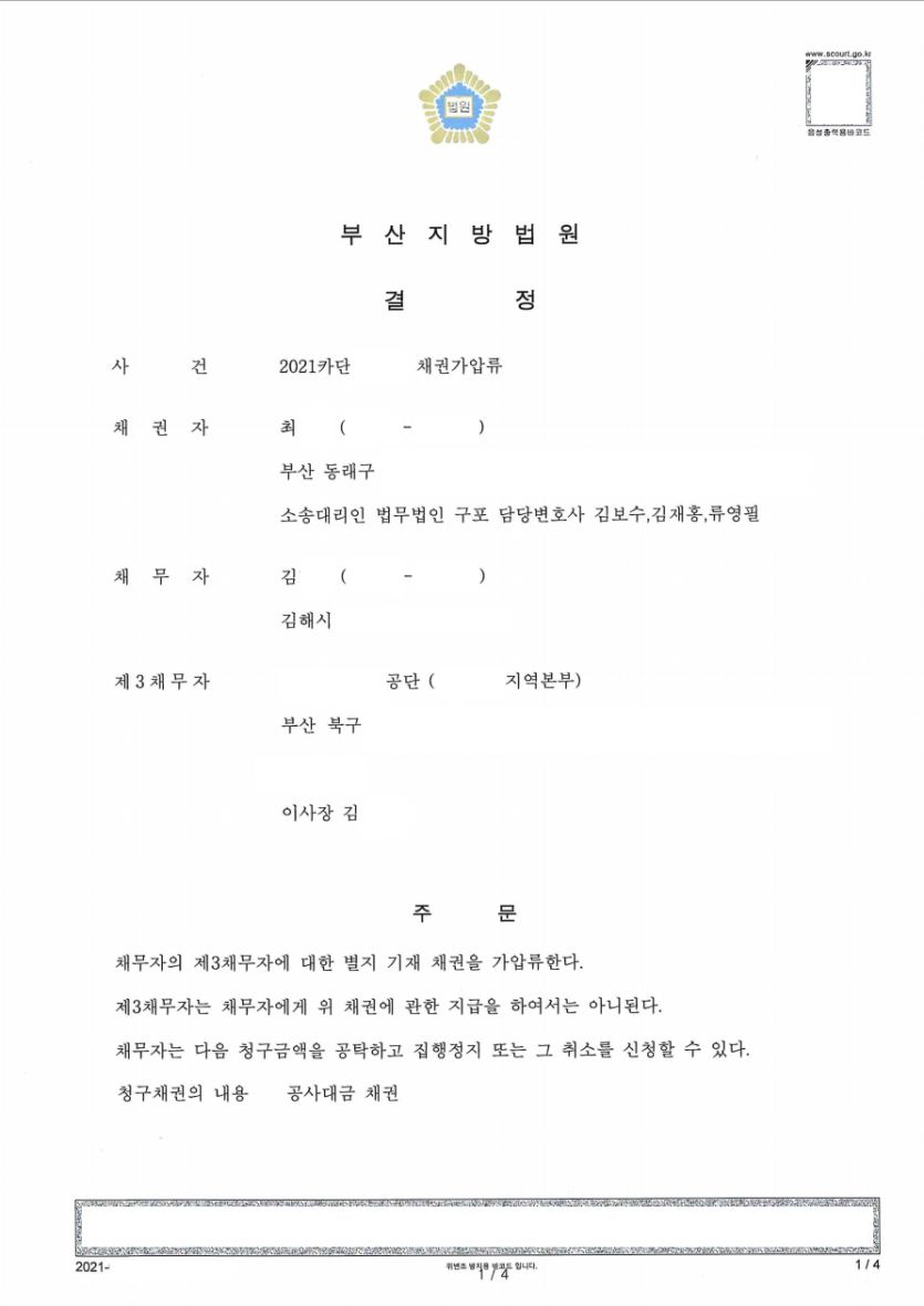 이에 재판부는 채권가압류신청임에도 이례적으로 청구금액 전액에 대하여 보증보험증권으로 갈음하도록 허가하면서 이 사건 신청을 인용하여 주었습니다.