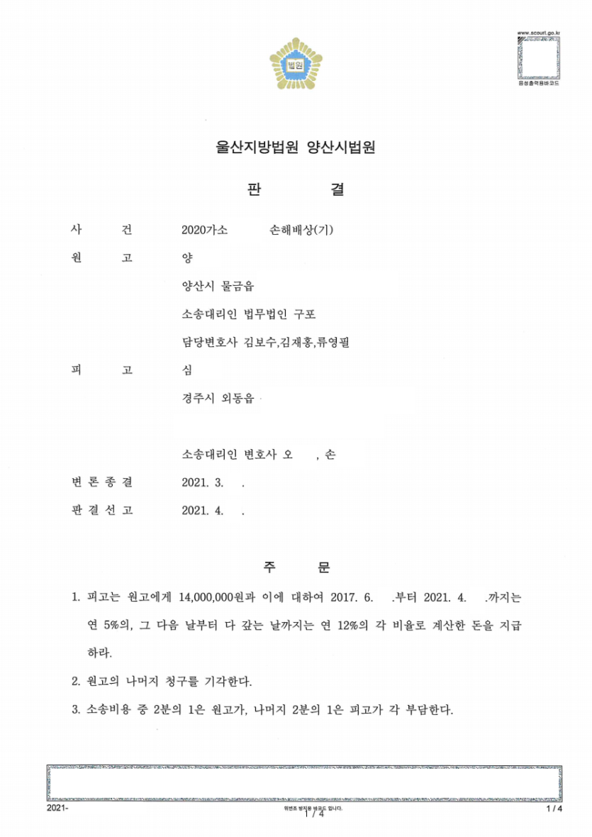 [이혼∙가사] 상간녀소송 - 손해배상 (일부승소)