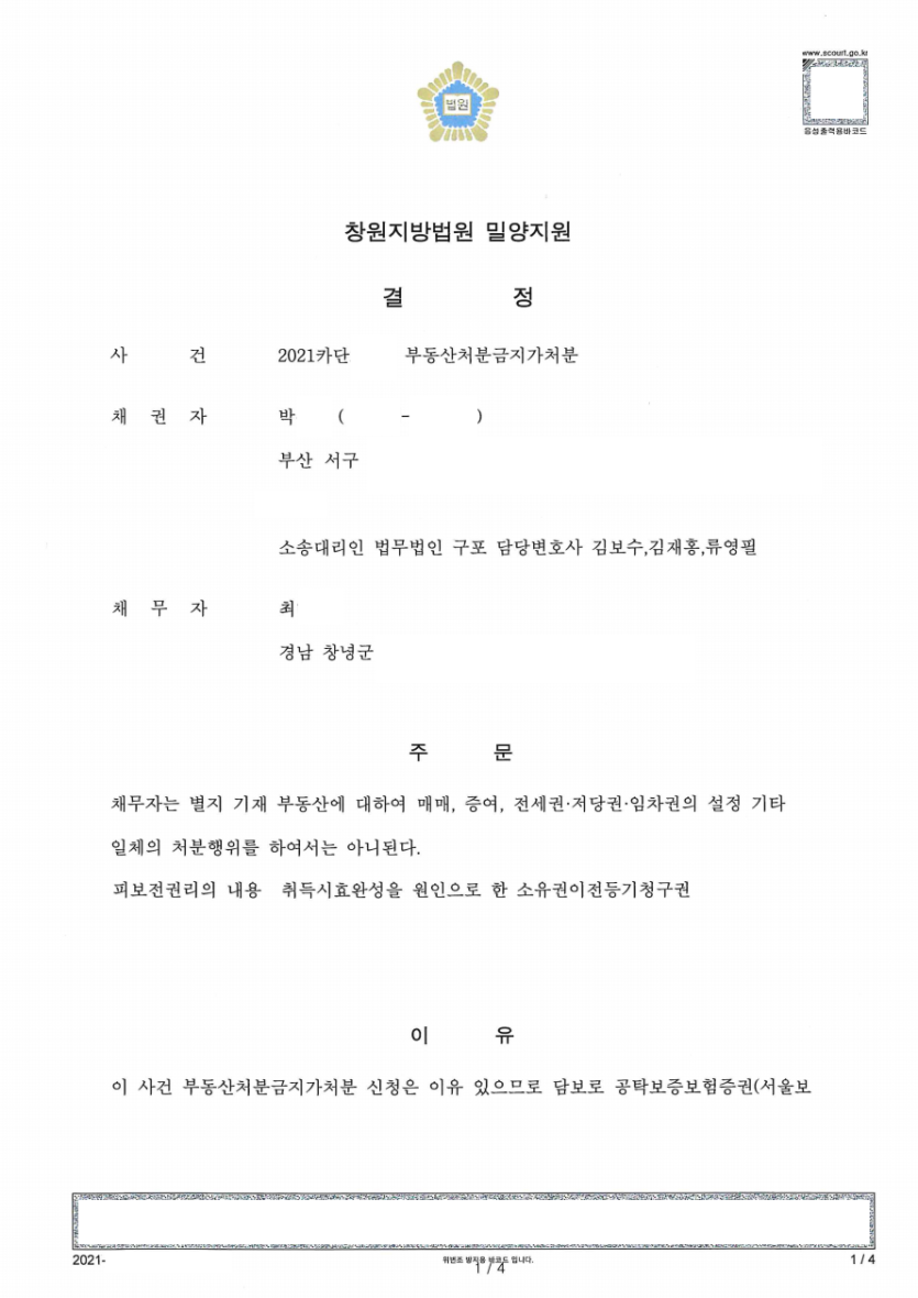 취득시효완성을 원인으로 한 이전등기 청구소송에 앞서 처분금지가처분이 반드시 선행되어야 하는바, 사건 담당 변호사는 토지 일부에 관한 취득시효가 가능하다는 법리 및 2차 점유취득시효가 완성된 사실 등을 적극적으로 소명하여, 처분금지가처분 인용결정을 받아낼 수 있었습니다.