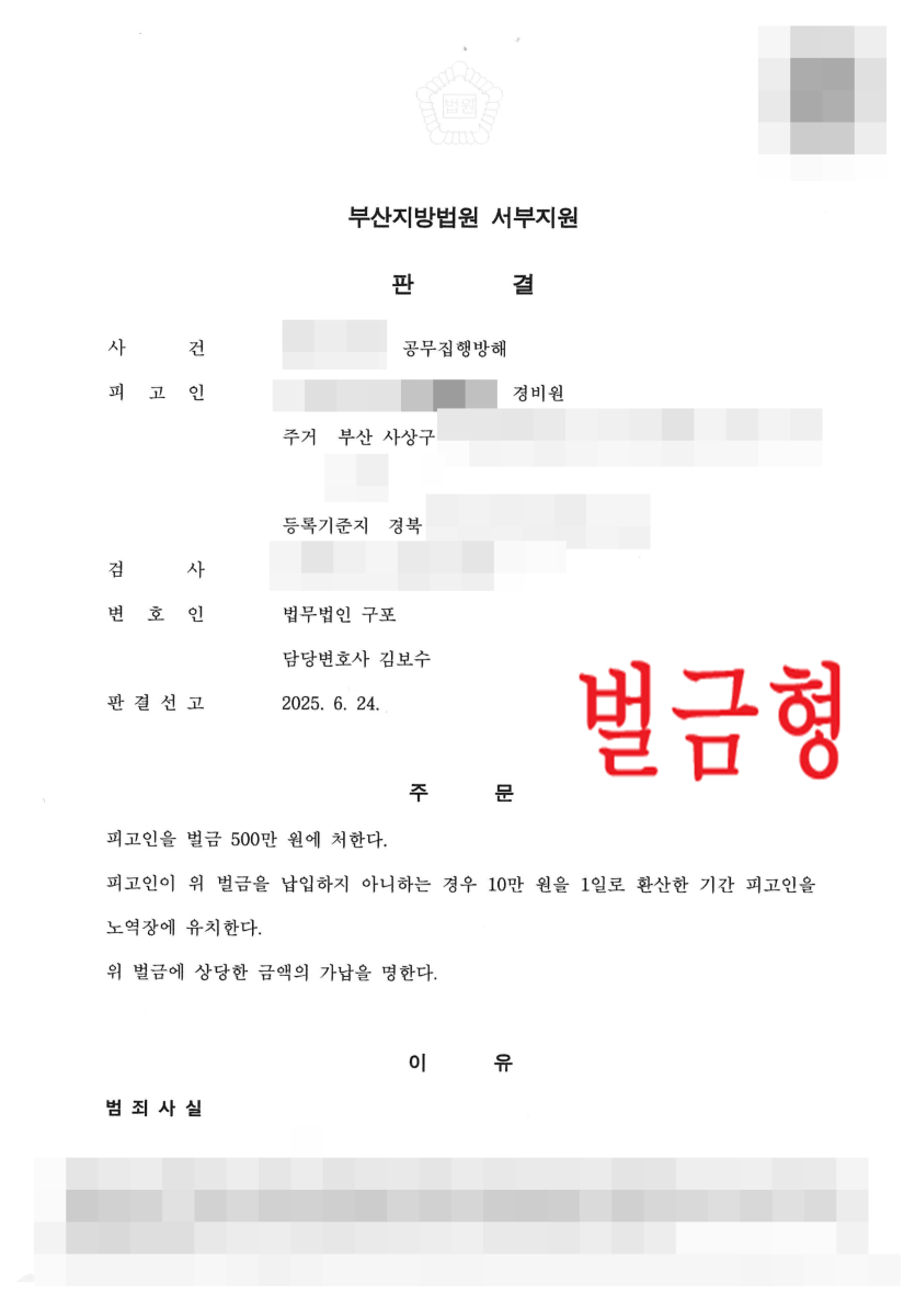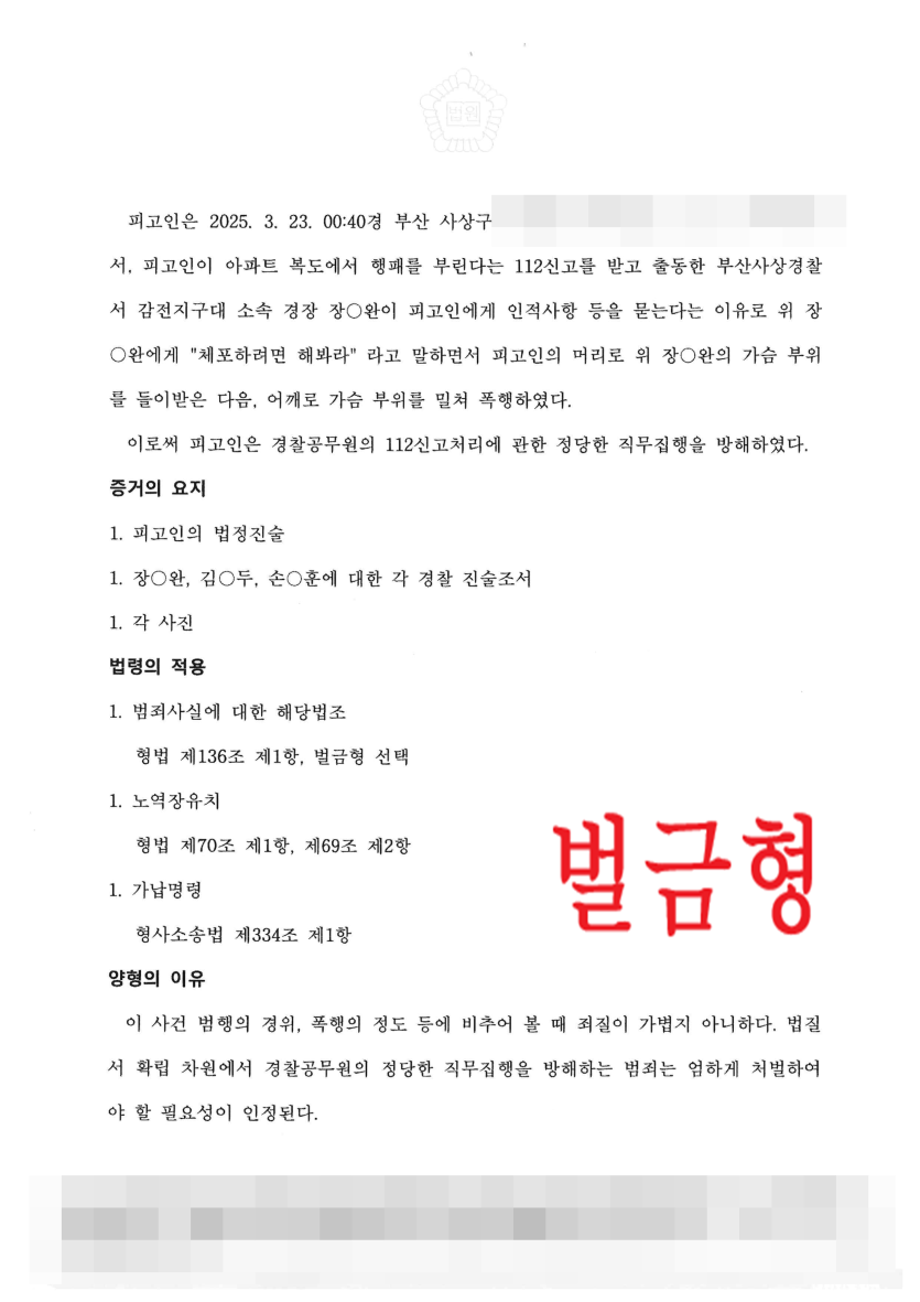결국 의뢰인은 현행범으로 체포되었고, 공무집행방해 혐의로 기소되어 재판을 받게 되었습니다.