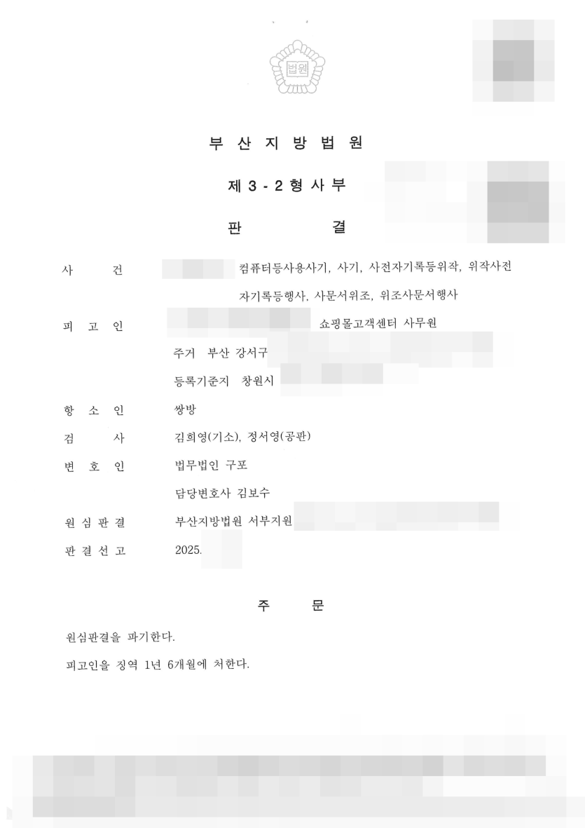 [형사] 사문서위조,컴퓨터등사용사기,사기 - 징역형(1년6개월)