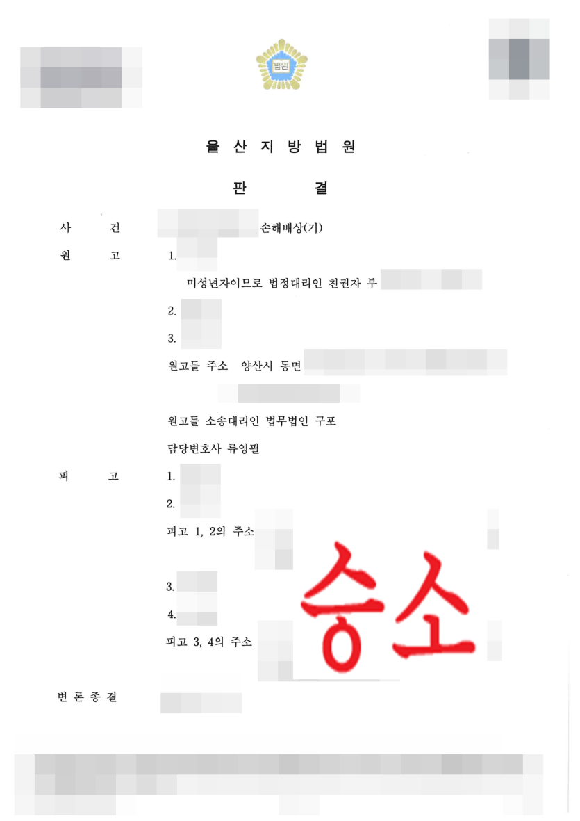 담당 변호사는 진단서, 진료내역서, 학교폭력대책심의위원회 조치결정 등 관련자료를 토대로 가해학생의 부모(피고들)가 부담하여야 할 손해배상 금액을 산정하고, 그들의 행위과 이 사건 손해 사이에 인과관계가 충분히 존재한다는 점 등을 이유 있게 설명하였습니다.