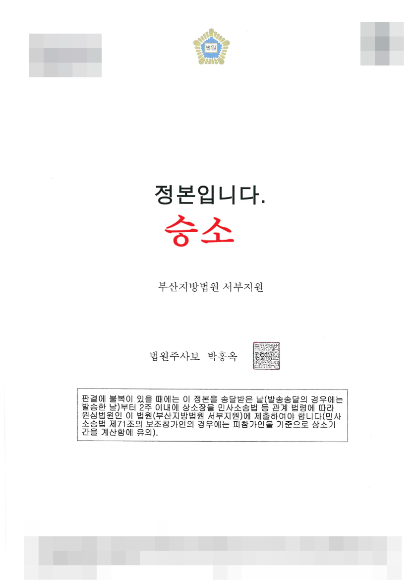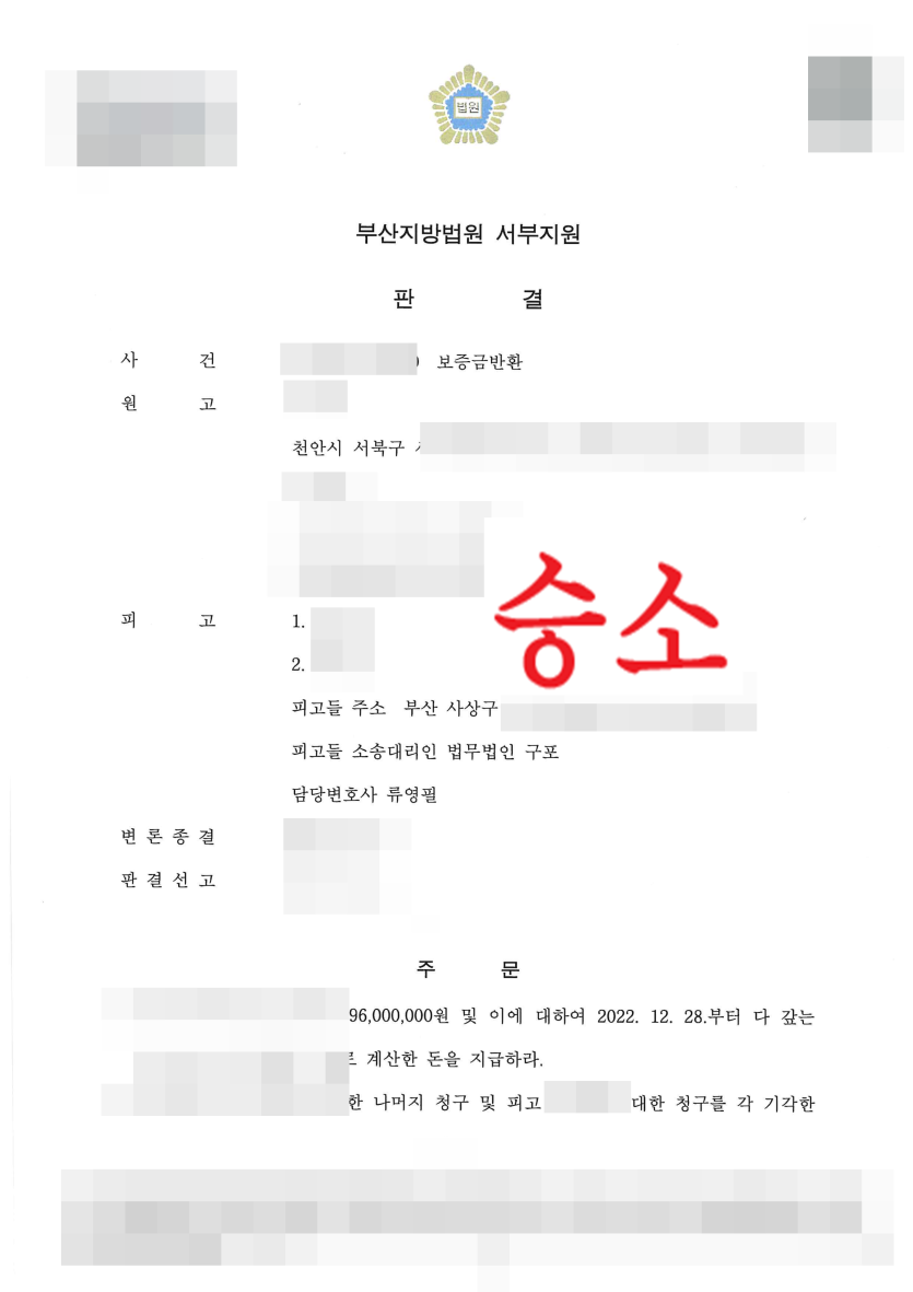 본 법무법인 담당 변호사는, 위 아파트의 소유자 겸 임대인은 등기부에 기재되어 있는 것처럼 피고2가 아닌 피고1인 사실, 원고와 피고1이 이 사건 임대차계약을 체결할 당시 선 순위 근저당권이 설정되어 있어 원고도 이러한 사실을 이미 잘 알고 계약에 응하였는바 피고1 및 피고2의 기망사실이 없었던 점, 피고1이 위 아파트를 제3자에게 매매할 당시 매매대금에서 원고의 보증금 중 일부만을 반환하기로 약속하고 원고가 위 임차건물을 피고1에게 인도하여 준 사실, 피고1은 실제 아파트 매각대금 중 일부를 원고에게 지급하고 이후 나머지 대금에 대한 공정증서를 작성하여 그에 따라 이자를 지급하고 원고도 변제기를 유예하여 준 사실 등을 입증하여 피고2에게 위 공정증서에 따른 책임이 없음을 인정받았고(원고청구 기각) 피고1에 대해서는 원고가 주장한 지연손해금 주장 중 1년 상당의 지연손해금은 지급하지 않아도 된다는 판결을 받아 피고1, 피고2 모두에게 만족스러운 결과를 제공할 수 있었습니다.