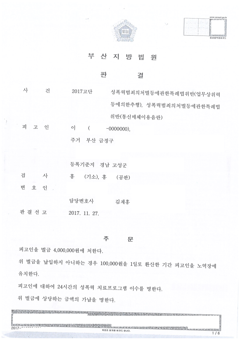 [형사] 성폭법위반(업무상위력등에의한추행, 통신매체이용음란) - 벌금형