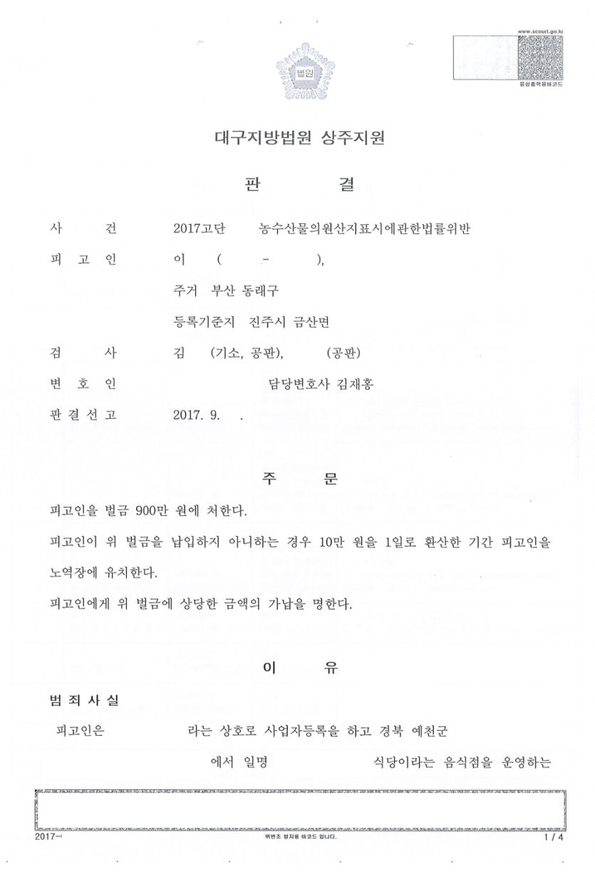 담당변호사는 피고인이 자신의 잘못을 반성하고 있다는 점, 식자재 도매상처럼 원산지 기망으로 인한 사회적 파급효과가 큰 위치에 있지는 않았다는 점, 이전에 요식업을 영위한 적이 없어 단순 착오에 의한 실수로 볼 여지가 있다는 점 등을 변론하였고, 그 결과 징역형의 선고를 피하고 벌금형으로 사건을 마무리할 수 있었습니다.