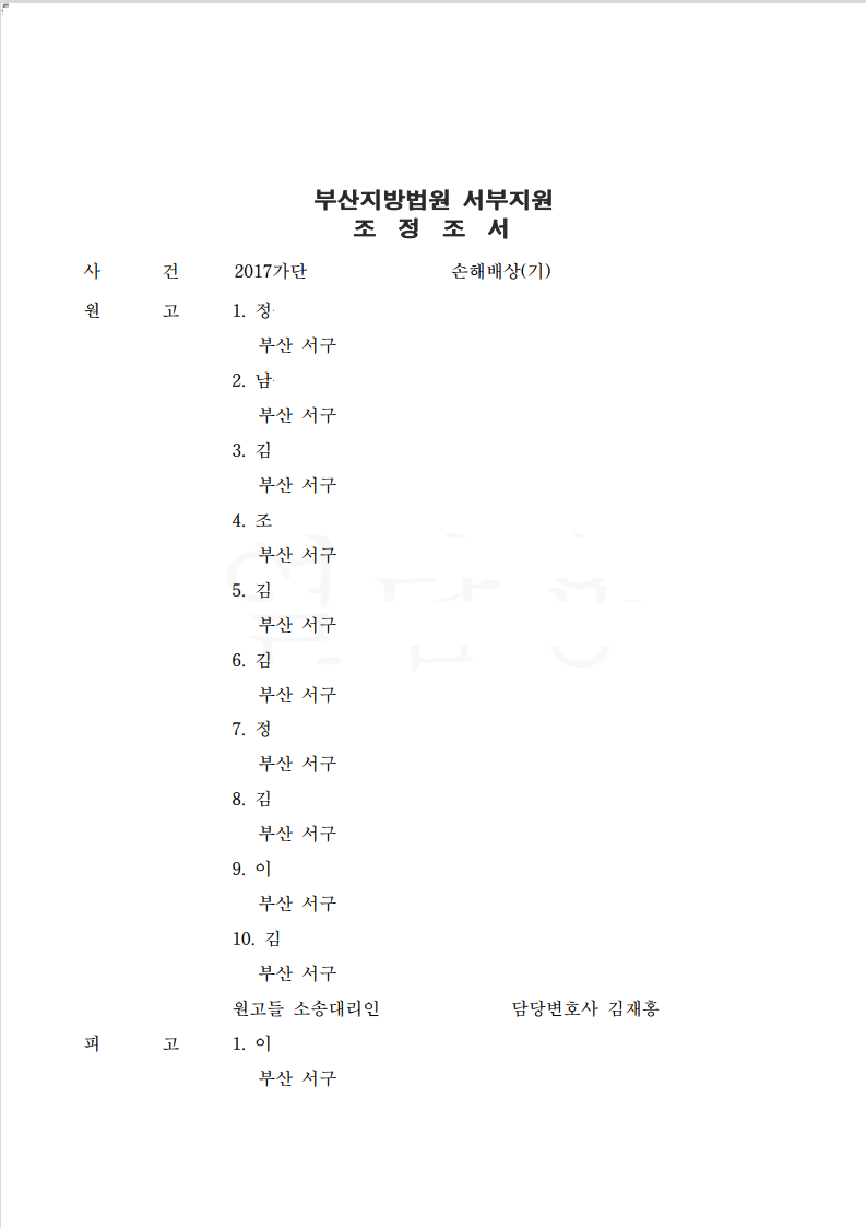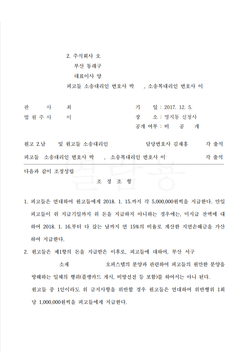 결국 위와 같은 변론과정을 통하여, 건축주와 시공사가 연대하여 원고들에게 각 5,000,000원을 지급하도록 하는 내용의 조정이 성립하였고, 분쟁이 원만하게 종결되는 결과를 도출할 수 있었습니다.