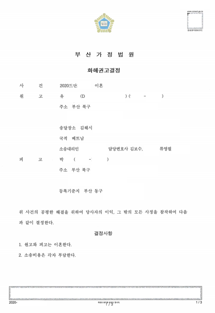 [이혼∙가사] 국제이혼 - 이혼성립(화해권고결정)