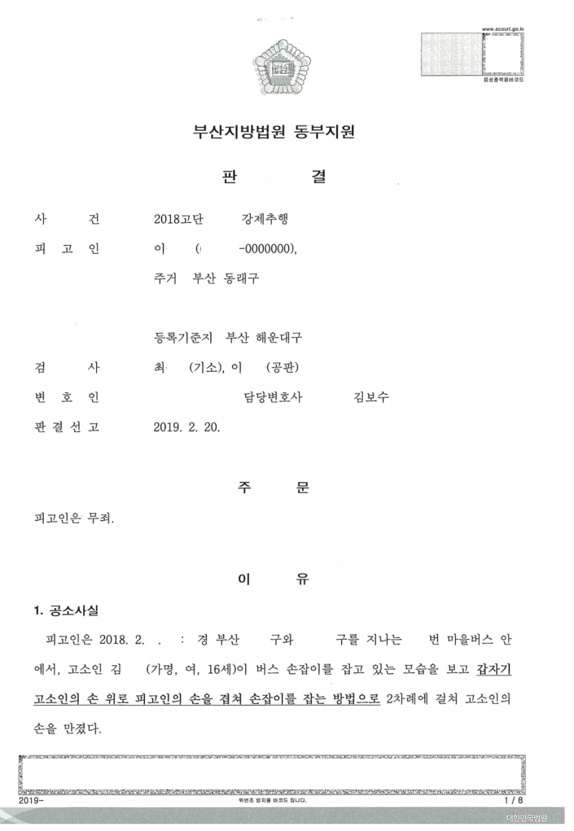 이 여성은 의뢰인이 ①버스에서 자신의 손을 잡았고 ②정류장에 내려서는 자신의 손목을 잡아끌고 갔다는 이유로 의뢰인을 경찰에 고소하였는데, 이후 알고 보니 이 여성은 고등학생, 즉 미성년자였습니다.