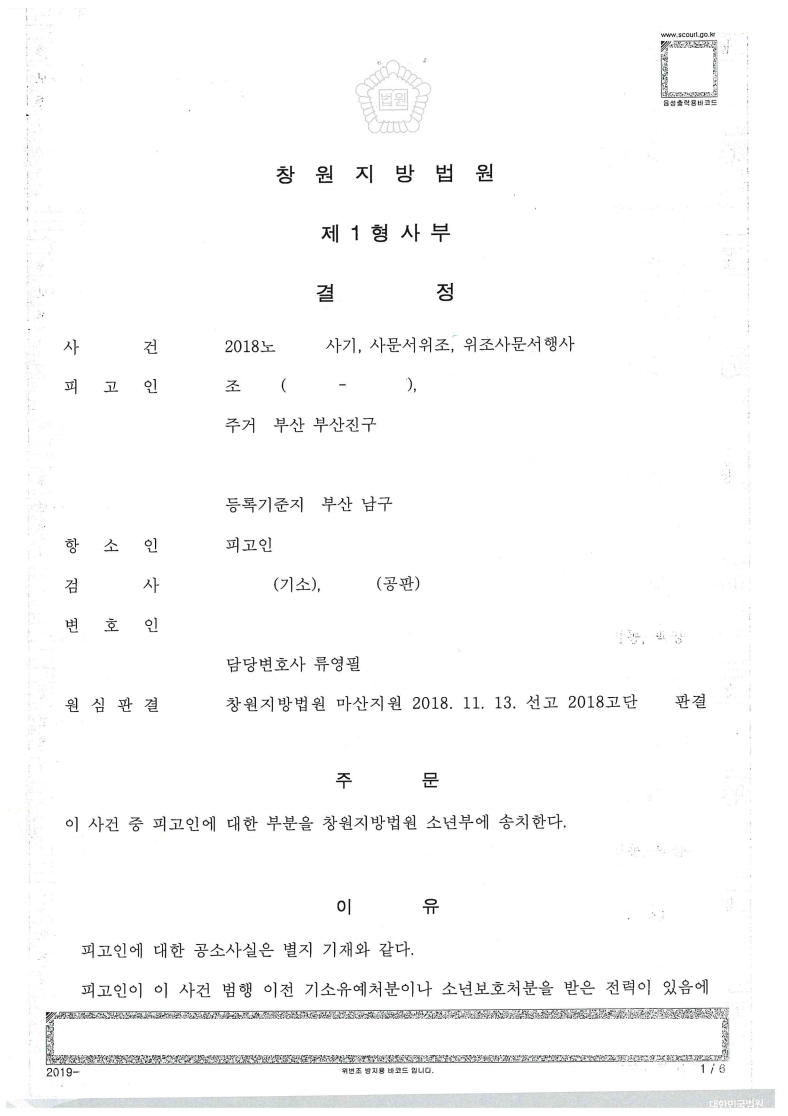 [형사] 사기 등 - 소년부송치 및 불처분결정