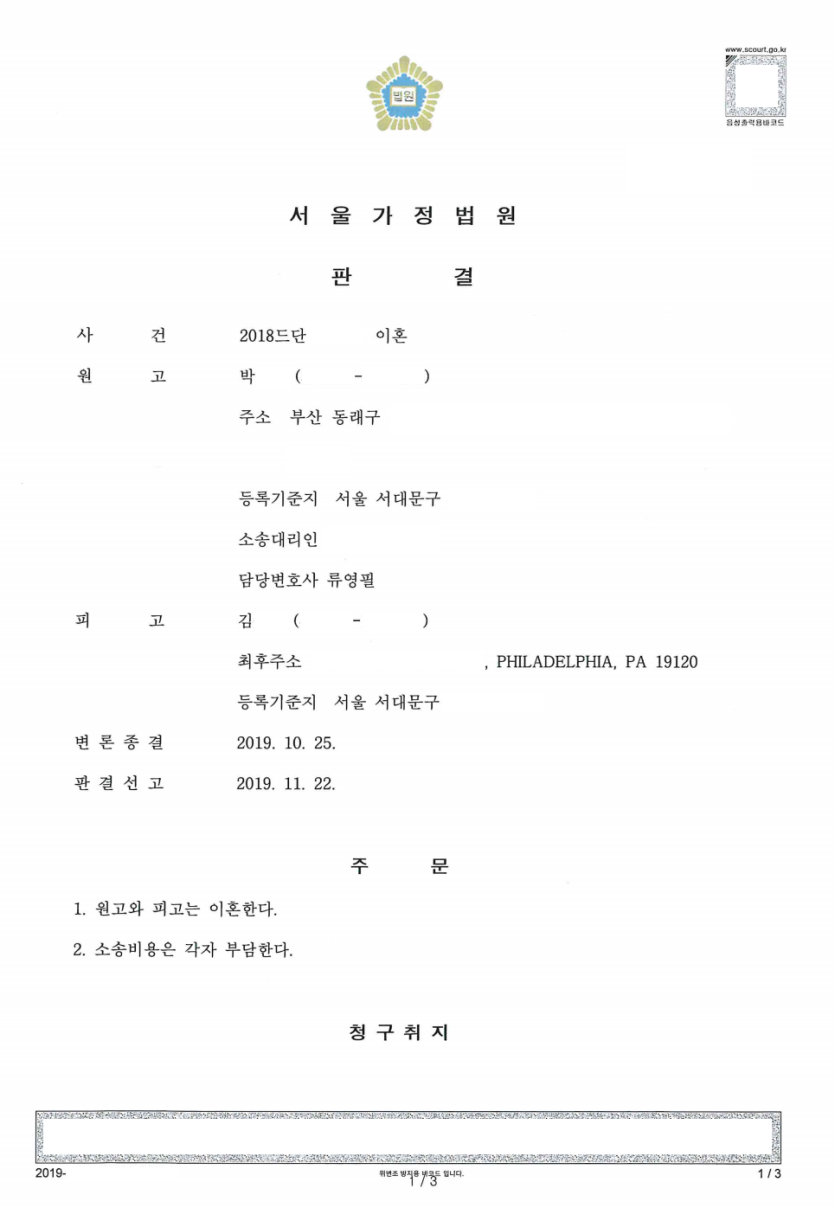 [이혼∙가사] 이혼 - 청구인용(승소)
