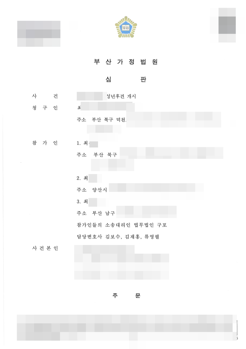 법무법인 구포 담당변호사는 상담 과정에서 사건본인에 대한 심판청구가 다른 형제들과는 아무런 상의 없이 청구인이 독단적으로 진행한 것임을 확인한 후 서둘러 나머지 자녀들이 절차에 참여할 수 있도록 참가신청을 하였습니다