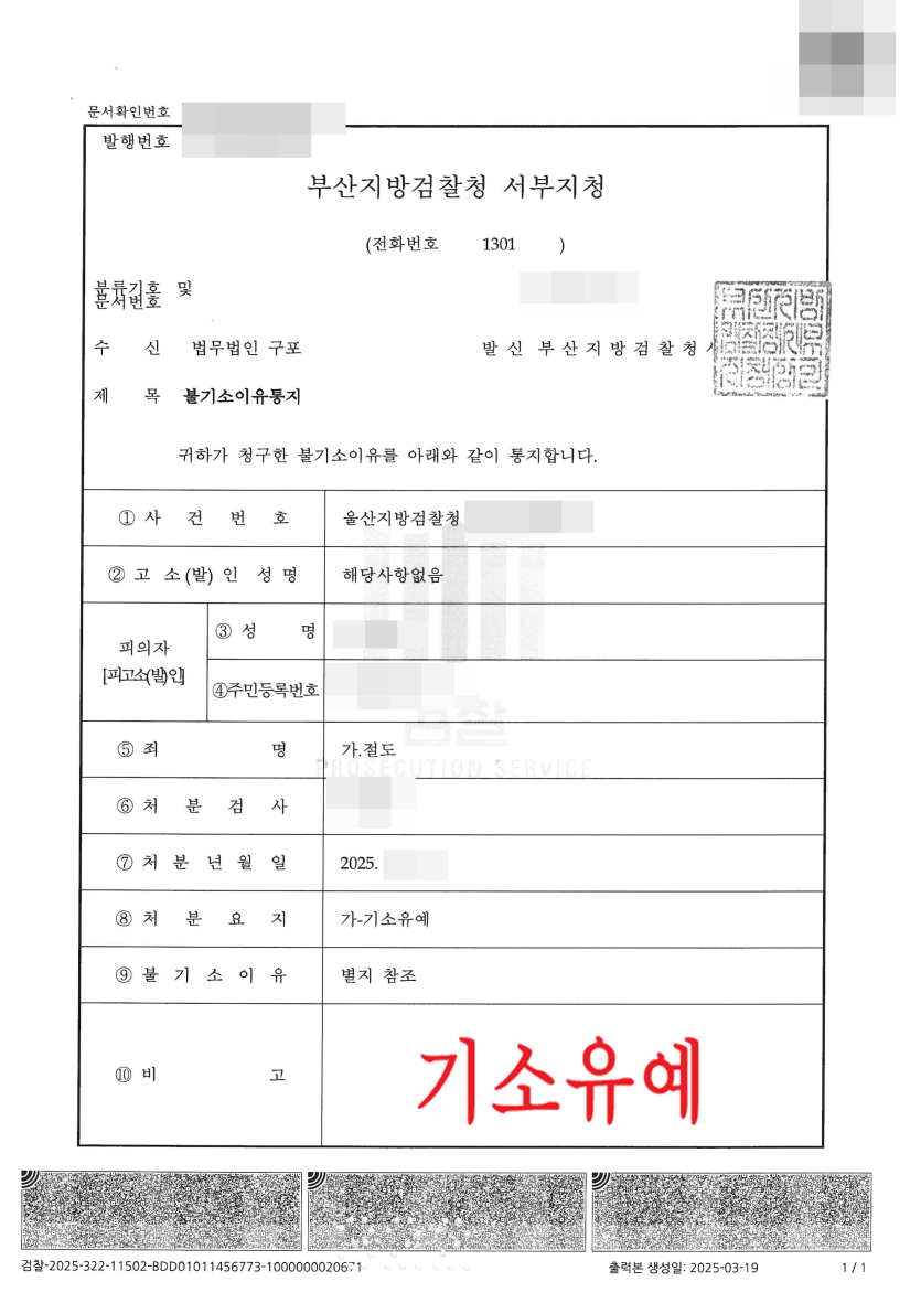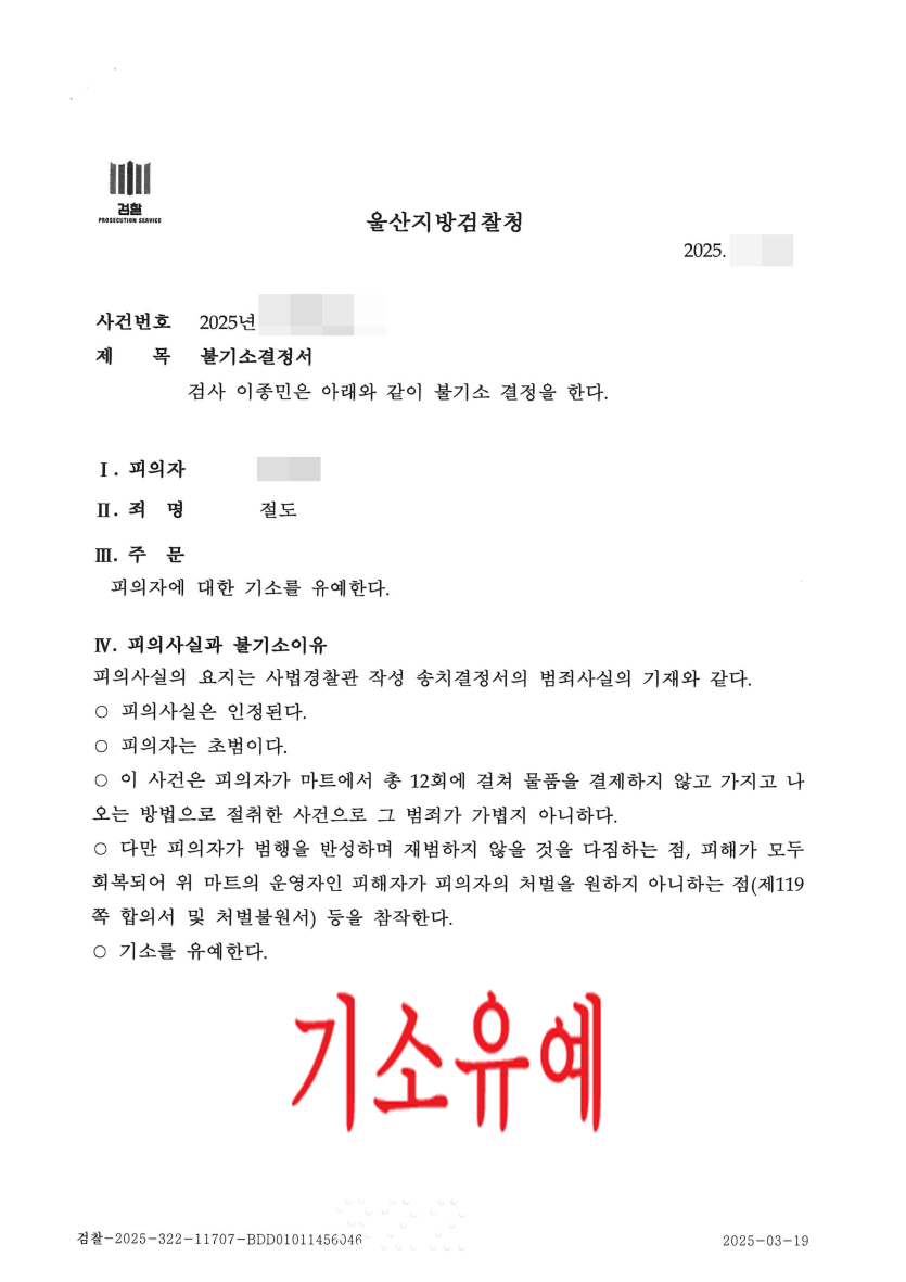 법무법인 구포의 변론을 받아들인 검사는 의뢰인에 대하여 기소유예 처분을 하였고, 의뢰인은 형사처벌의 위험에서 벗어날 수 있었습니다.