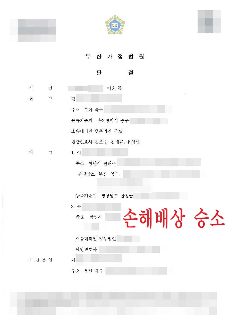 법무법인 구포의 주장을 받아들인 재판부는 의뢰인의 남편과 상간녀에게 손해배상의 책임이 있다는 판결을 내렸고, 의뢰인은 지옥같은 시간에서 해방될 수 있었습니다.