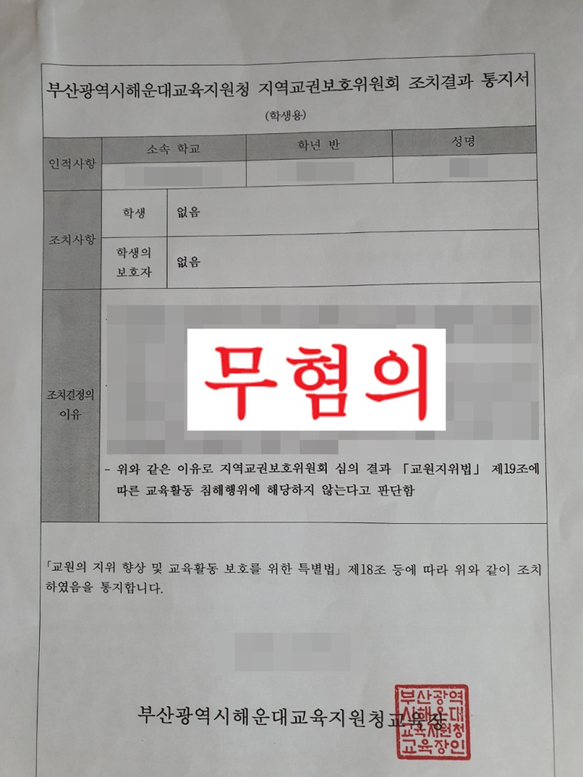 이에 교권보호위원회는 A학생 및 대리인의 변론을 받아들여 A학생에게 ‘조치없음’결정을 내렸고, A학생은 무사히 학업에 복귀할 수 있었습니다.