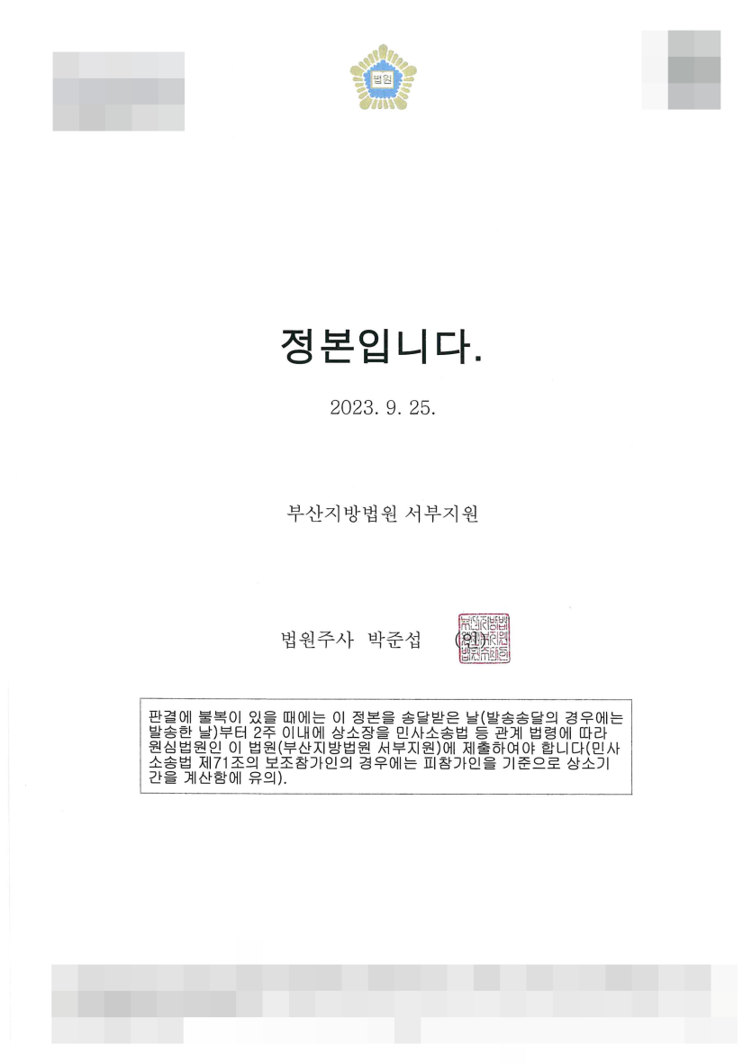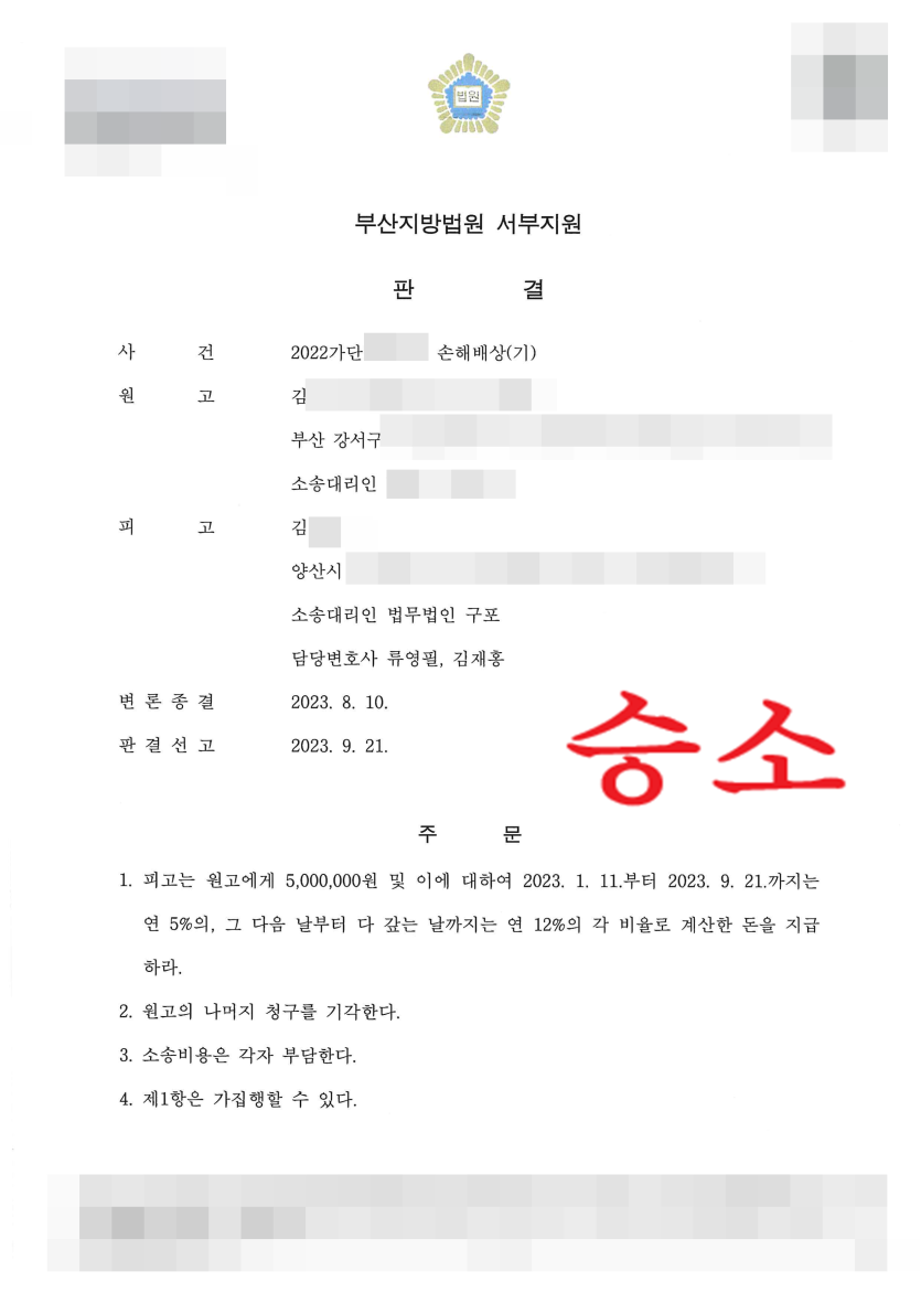이에 법무법인 구포 담당변호사는 소송과정에서 이를 충분히 피력한 바, 원고가 청구한 금액(30,000,100원)을 대폭 감액하는 내용의 판결(5,000,000원)이 선고되었습니다.