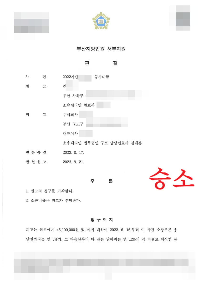 법무법인 구포 담당변호사는 우선 원고가 주장하는 계약 내용이 실제 사실관계와 다르다는 점, 원고가 제대로 하청업무를 수행하지 아니하여 직영의 인력까지 투입되었다는 점을 집중적으로 변론하였고, 증인신문과정까지 거친 끝에 원고 청구를 전부 기각하는 판결이 선고되었습니다.