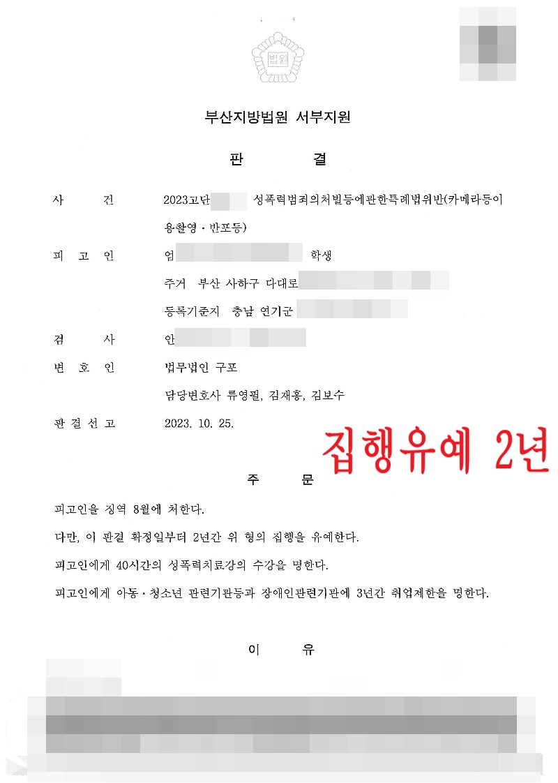 카메라등이용촬영반포(카촬죄,반포죄) - 집행유예 2년