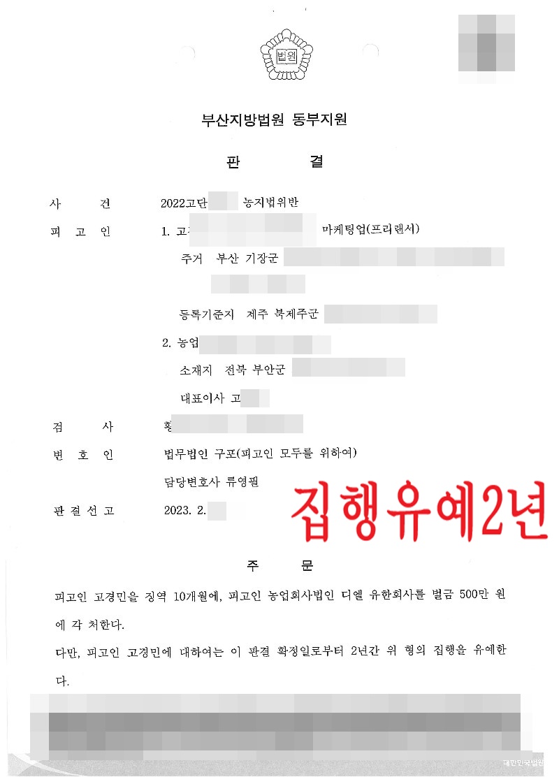 이에 법무법인 구포 담당변호인은 수사단계에서부터 참여하여, 농지법위반과 관련 없는 부분은 적극적으로 변론하는 한편, 농지법위반에 해당하는 행위는 모두 인정하고, 피고인이 이러한 범행에 이른 경위 등을 설명하면서 선처를 구하는 방향으로 변론을 펼쳤습니다.