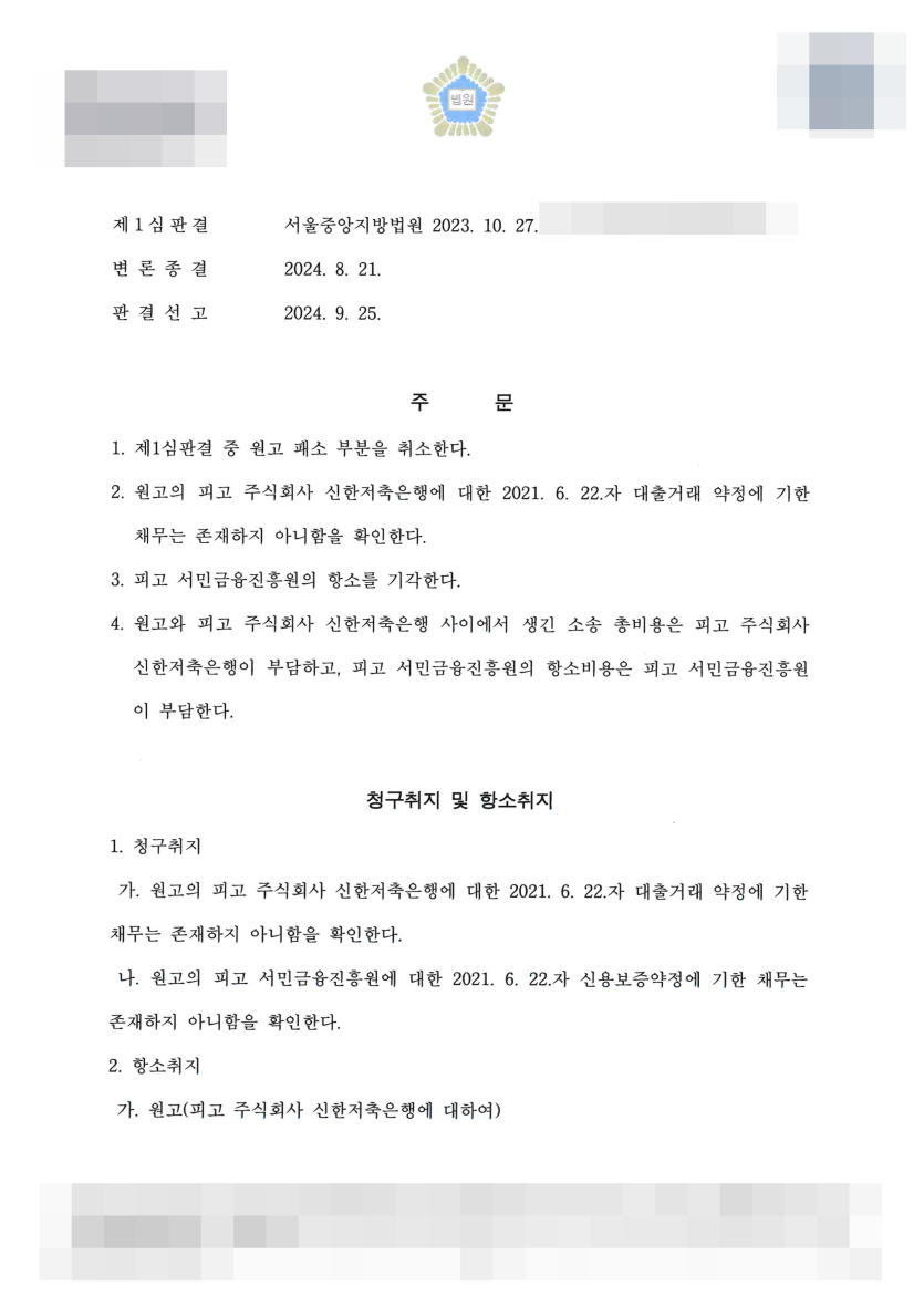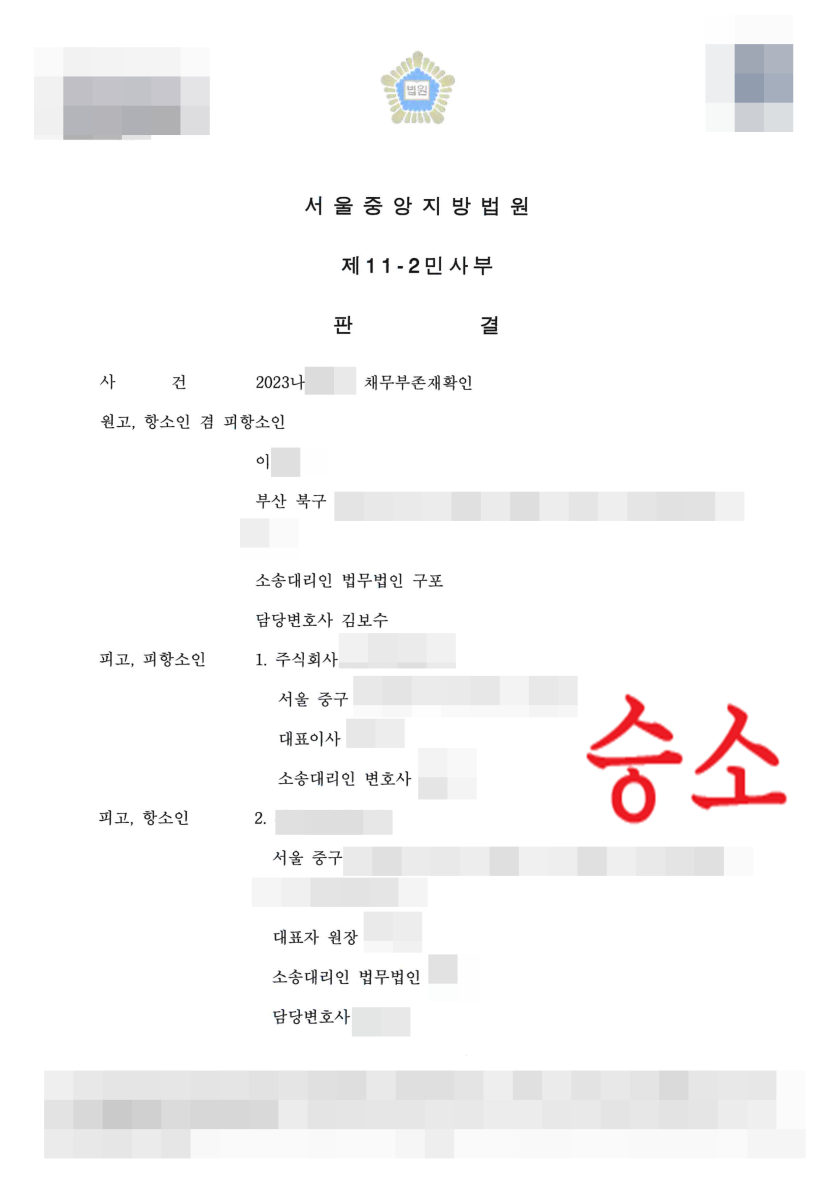 법무법인 구포 담당변호사의 주장을 받아들인 항소심에서는 의뢰인의 대출금 채무가 없음을 확인해 주었고, 의뢰인은 자신도 모르는 채무에서 벗어날 수 있었습니다.