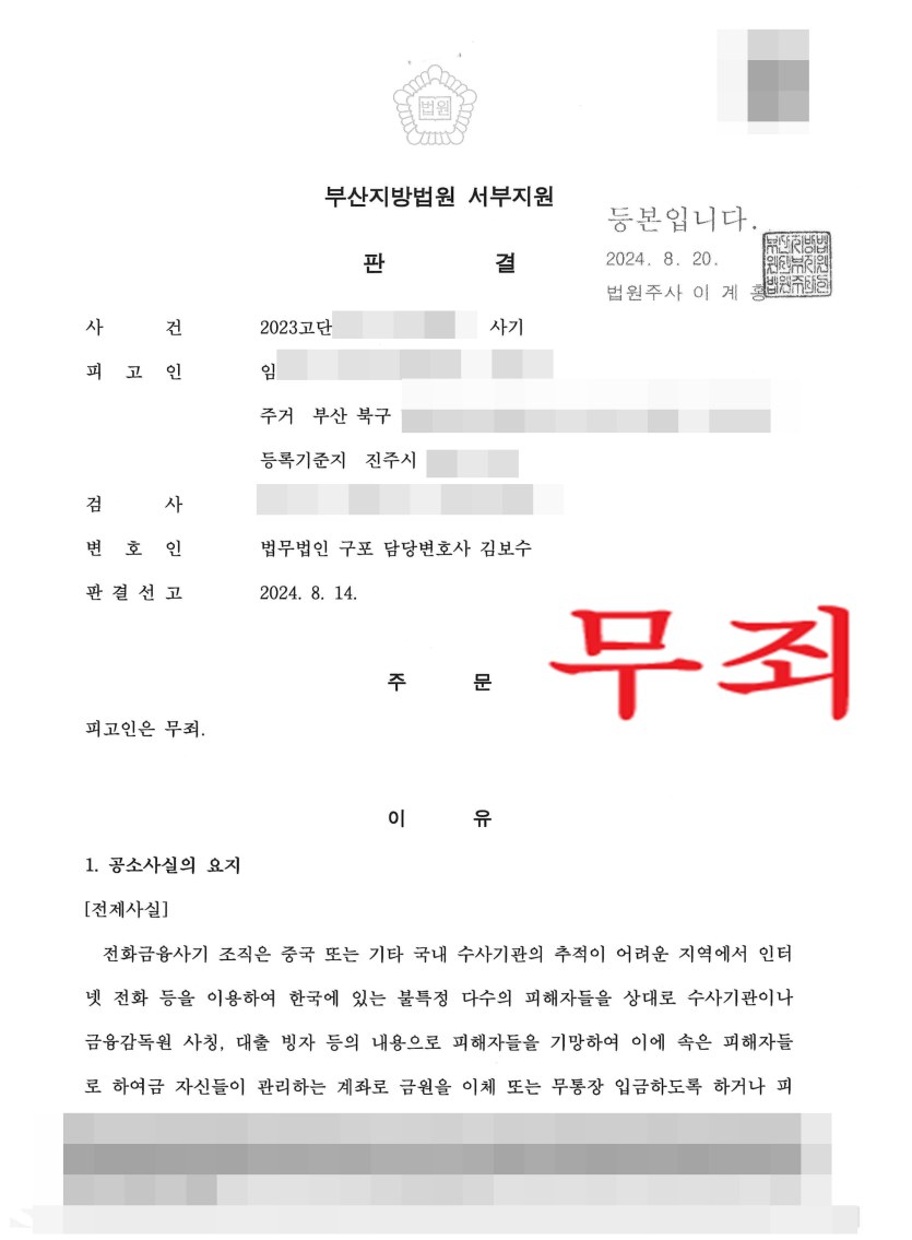 [형사] 보이스피싱, 사기 - 무혐의(승소)