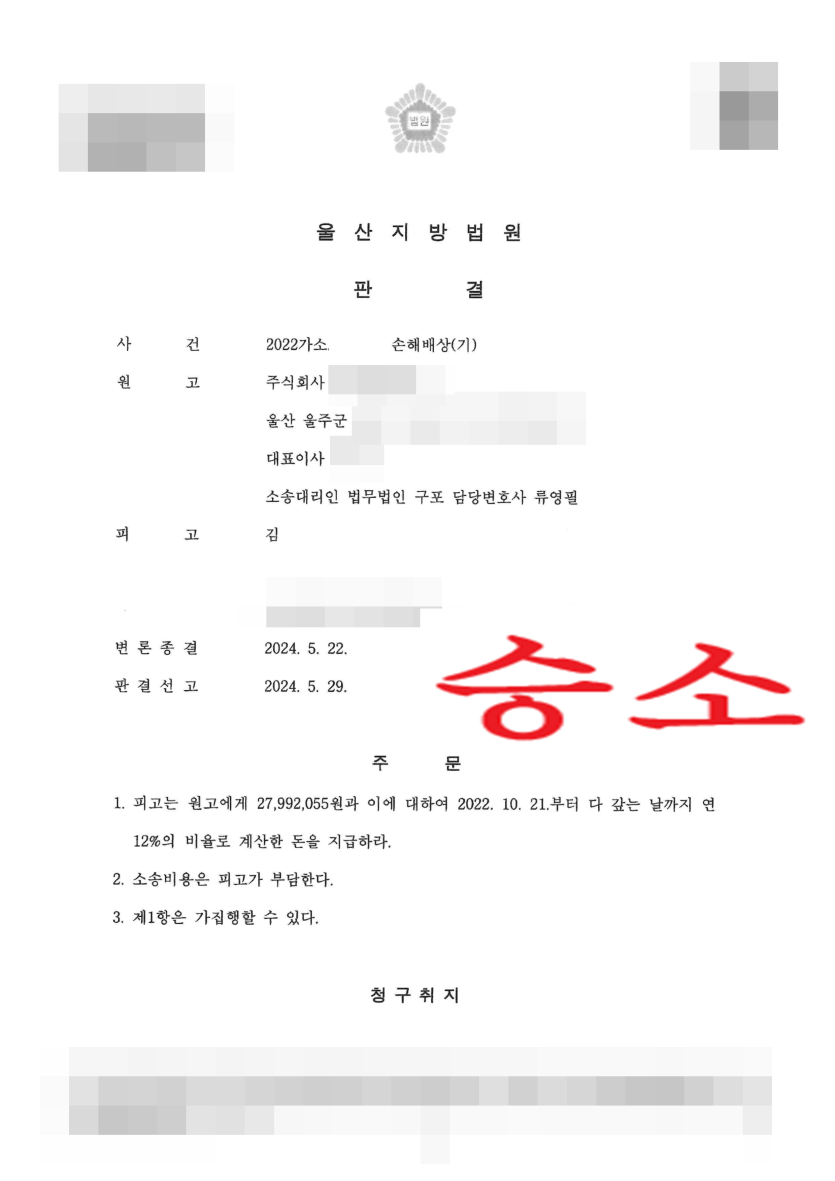 이후 법무법인 구포 담당 변호사는 소장 제출 단계에서부터 손해배상 청구의 요건 사실을 정확하게 적시하고, 해당 주장의 증거를 빠짐없이 제출하였습니다.