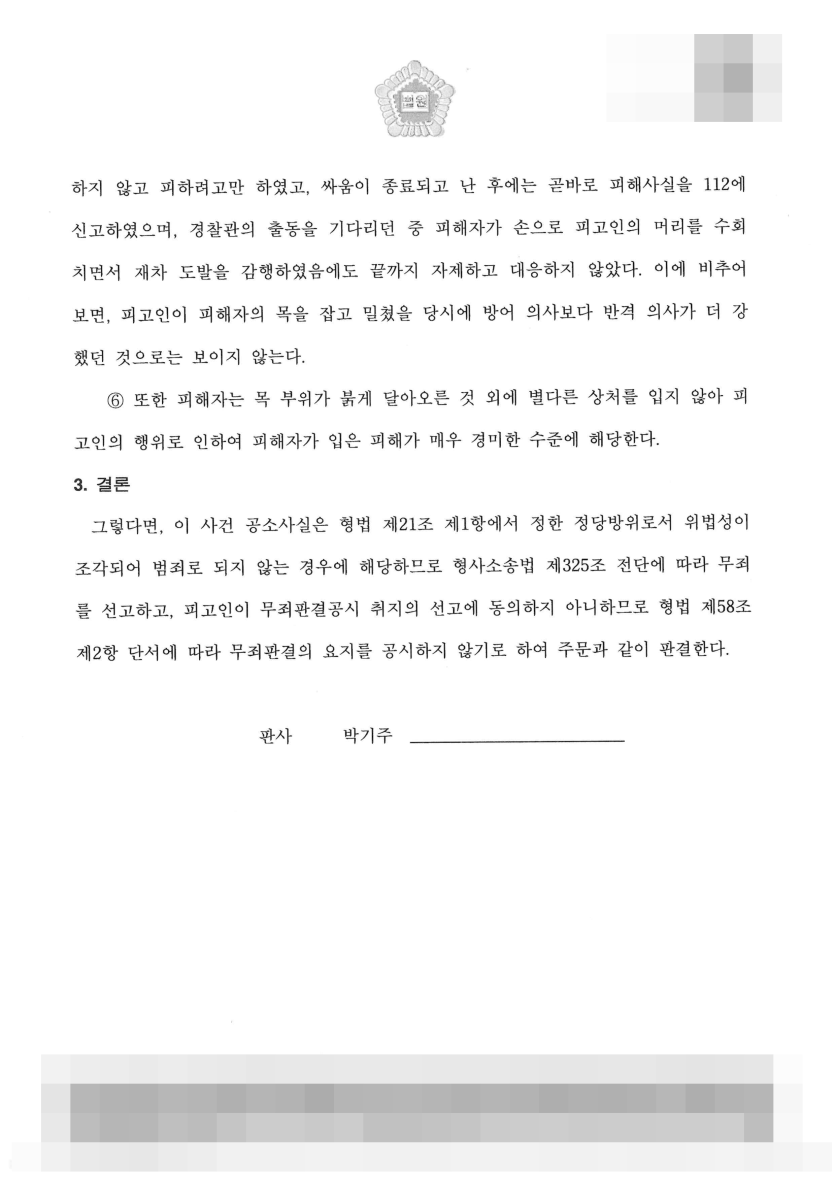 그러나 정당방위 요건이 갖추어진 경우 재판을 통하여 무죄를 받을 수 있으며, 전문 변호인의 조력을 받아 정당방위의 요건이 갖추어 졌음을 입증하는 것이 무죄를 받기 위한 핵심이라 할 수 있습니다.