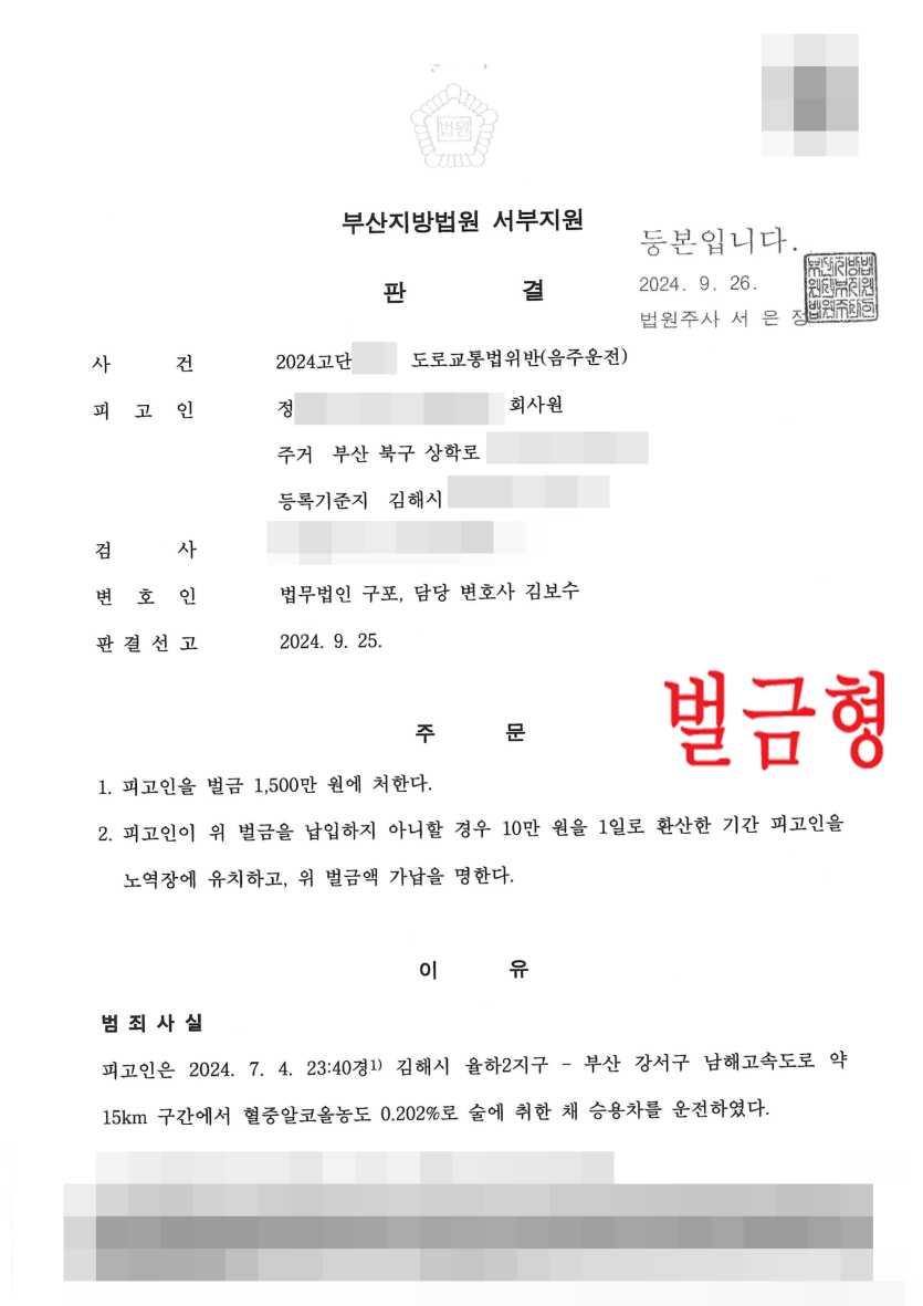 법무법인 구포 담당변호사의 변론 끝에 재판부는 의뢰인에 대하여 벌금형을 선고해 주었고, 의뢰인은 직장을 지킬 수 있었습니다.