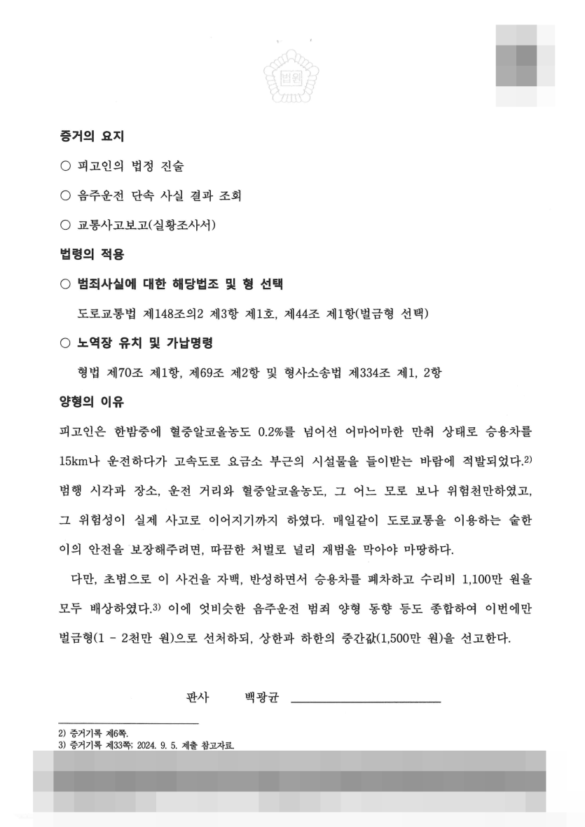 법무법인 구포 담당변호사는 우선 의뢰인의 음주운전으로 파손된 시설물에 대하여 변제 후 변제내역을 재판부에 제출하여 이 외의 물적, 인적 피해가 발생하지 않았음을 소명했습니다.